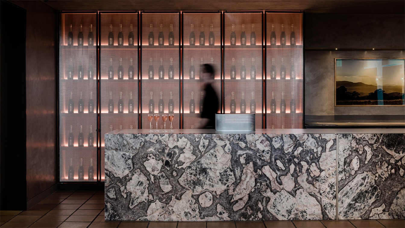 Similarly, the process of transformation in winemaking informed the organisation of space. ‘Compression/Release’ is revealed in enclosed, intimate spaces – the Tasting Room for example – and airy, exuberant zones, like the Lounge Bar. Open, woven materials are juxtaposed with the solidity of weighty, opaque substances to allude to the duality of density and lightness in sparkling wine.