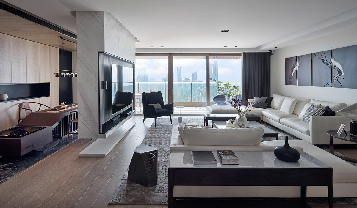都会丛林之中,难得寻觅一处绿意,公园、海景尽在眼前。以大面开窗引景入室,刻意选用低台度家具,让城市景观与自然美景尽入眼帘。