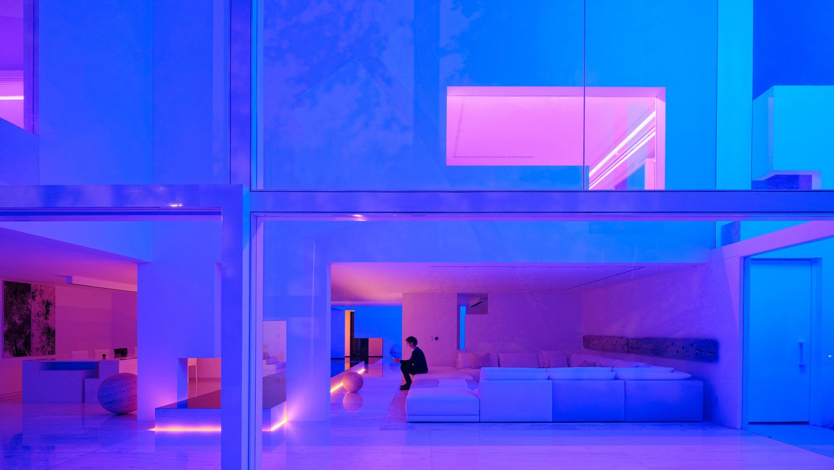 At night, the all-white interiors are transformed into a three-dimensional canvas of neon colours that harmoniously blend into each other. Bright blue, orange, purple, pink and red hues illuminate the rooms that cast a prismatic glow out of the windows. The colour scenarios also allow the ambience of the rooms to tune in to the occupants’ mood.