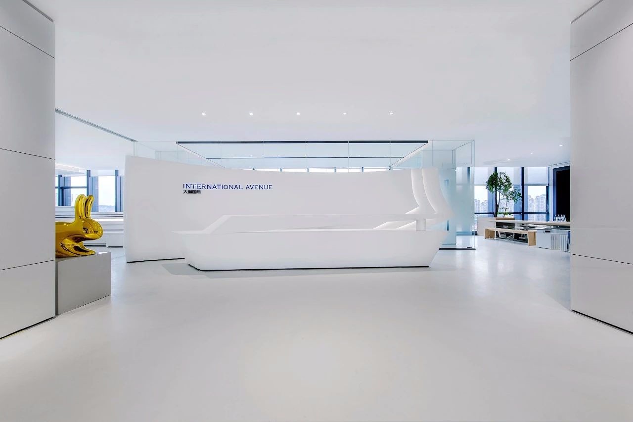 前台区域作为办公室的初步印象,投射艺术科技感。曲面造型勾勒出冷冽的线条,面与面之间相互交汇、重叠、融合,与一侧的金属艺术品进行趣味对话。