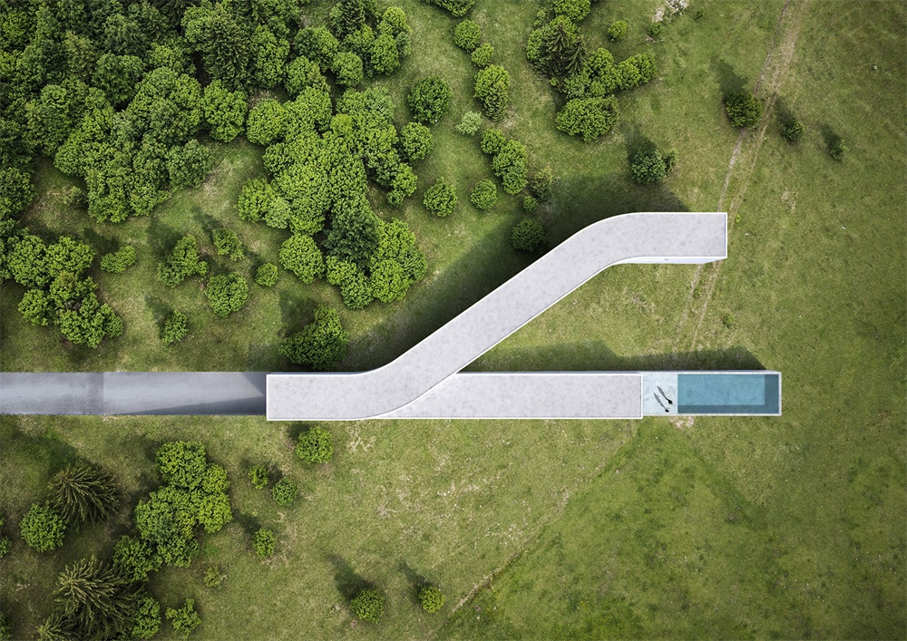 emerging from the sloping hills and overlooking green terrain, the single-family residence is built on a longitudinal surface with a triangular geometry. a linear architecture houses an open living area, accommodating shared spaces which include two offices, a kitchen area and a living room. meanwhile, a second volume unfolds from the point of contact, housing the homes private functions.