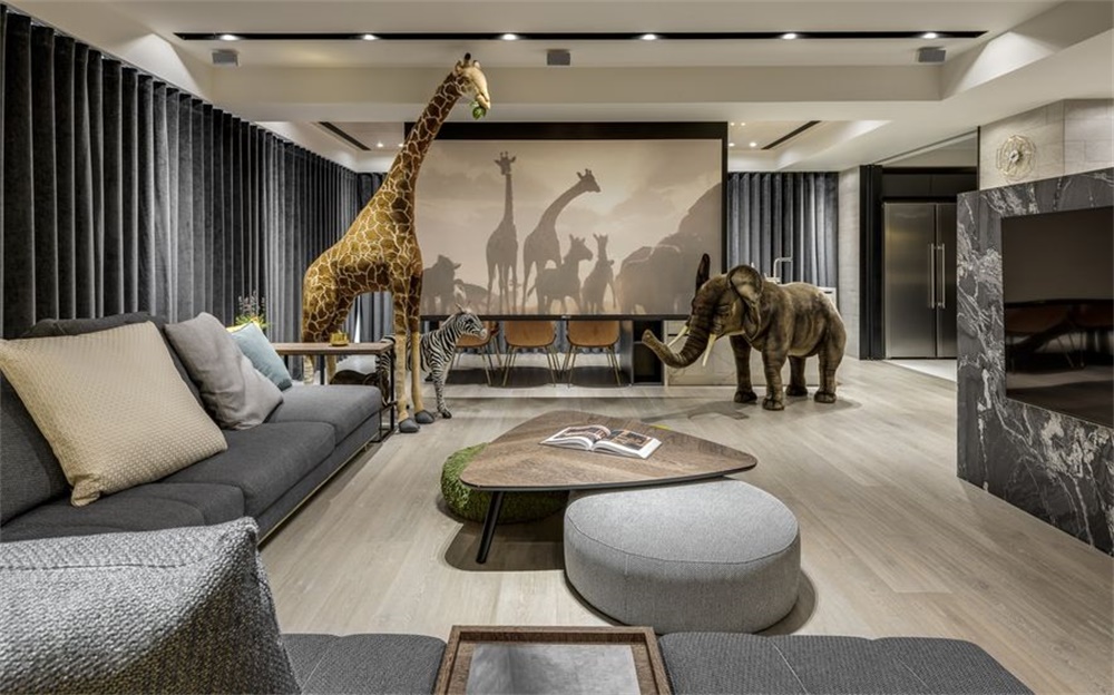 自然环境既是一家人快乐的泉源,于是回归家宅尺度,设计师将公领域转化为情感活络的游乐场。家的凝聚,是屋主期待的空间氛围,设计师因而于电视墙一侧,架设巨型投影幕,当灯光熄灭,宛如置身剧院,营造身历其境的观影体验;至于原石般屹立的电视墙体,则在综合考虑室内外光线来向后,经过数次精密调校,特意采用偏离场域中轴之划设,提供益加全面的舒适观影体验;使每个起居面向皆收揽良好景观,只消沉浸沙发放懒身体,与家人一同惊奇于视觉旅程中的辽阔场景!