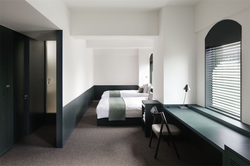 对于三楼及以上来说,与下面的两层相比,他们强调了这个放松休息的空间的理念。每个房间的功能都被保持在最低限度,但配备了高质量的床垫,卫生间/浴室用马赛克瓷砖来营造一个放松的环境。整个酒店使用的青苔绿色基调颜色,可以根据其照明条件表现出不同的氛围。
