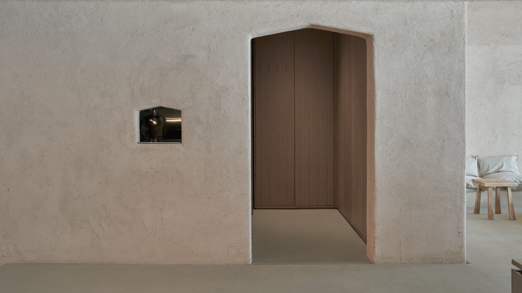 Woven wool cushions from Swedish textile brand Astrid have been scattered across the banquettes as decor. Fluted-glass wall lights by Lebanese brand PS Lab also dot the clay walls, joining the recessed spotlights by Flos across the ceiling.