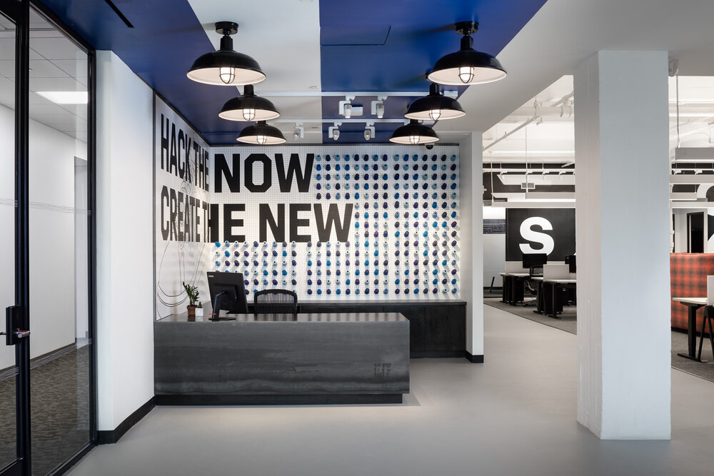 To nurture creativity and innovation the design takes inspiration from sports, speed, and creator culture. Stadium light fixtures illuminate the showroom corridors, with super-graphic wayfinding numbers recalling arena signage. The central elevator and service core is clad with corrugated metal panels, custom perforated for acoustic performance and set at the sixty-degree angle of the famous Three Stripes. The industrial language of the former factory is preserved and celebrated by up-lighting the masonry piers and exposing the high ceilings, keeping mechanical and other building systems carefully organized and coordinated. A palette of expanded metal, hot rolled steel, cast concrete, and vibrant site-specific art resonates with Adidas’ vision of authenticity and urbanity.