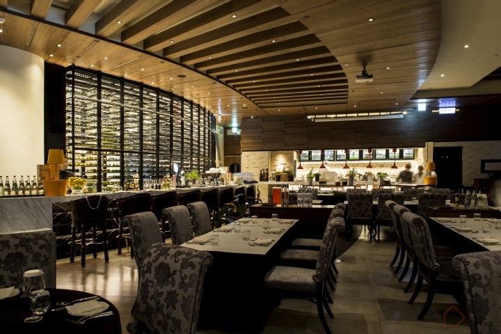 在红酒墙前面是一个优雅的吧台作为前台,是整个空间的焦点,也强调了DA-ANTONIO的餐饮服务,同时给客人们带来开放和放松的感觉(吧台的设置已经成为每一个DA-ANTONIO意大利餐厅非常重要的一部分,代表了这个整个广为人知的餐厅的主题和影响力)。设计师希望通过对材料的选择和细节的注入,使整个空间具有一种历史感的同时让人感觉温暖,比如说意大利石灰华,黑色大理石和有着优雅银色装饰的胡桃木单板,以及由多彩的古董镜子拼贴而成的背景等。