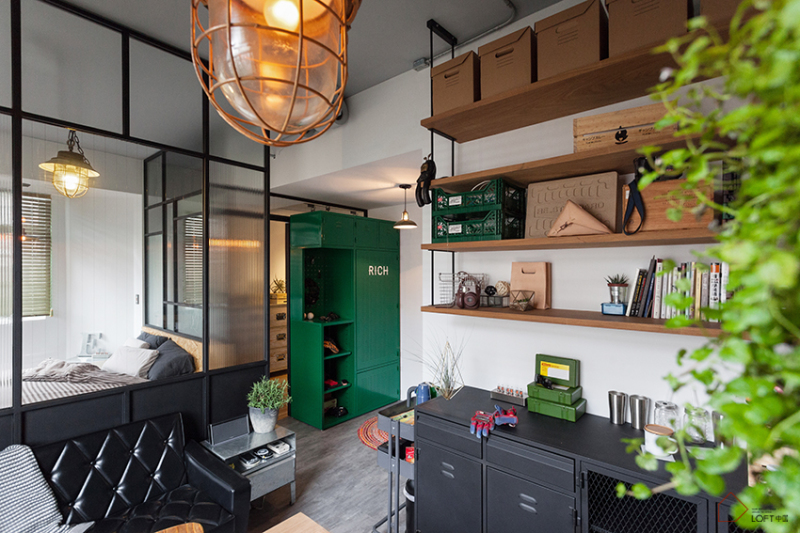 小空间打造工业风最怕黑色铁件占比太多,让室内区域变沉重,记得调整一下色彩比例,加入白色墙面运用,拥有明亮感同时减少压迫!就像来自台北 隐室设计 In situ interior design 的单层小套房改造分享,新婚夫妻刚成家与家人分层居住,仅有 42平米套房需要容纳客厅、餐厅、卧室与浴室,格局恰巧跟许多租屋族相同,为了增加可用面积,隔间运用铁件搭配传统花玻璃,形成半遮蔽又同时让采光更好,再加些老件灯饰,多些混搭老氛围。