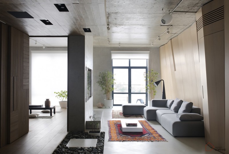 设计中参考日式传统风格。公寓在几年前完工,进入其中呈现的是最原始的状态。混凝土的自然外表正好符合设计理念,所以有必要予以保留。设计亮点:异形墙,20米长的曲面墙横贯空间:门廊、茶室、花园、厨房和用餐区。