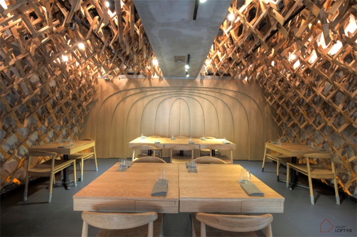 大型土水泥制成的服务吧台,配备了定制的手袋挂钩。悬挂在上方的手工陶瓷灯具由泥岩制成,桌子设计独特的餐具抽屉,满足工作人员使用需求。空间内部巧妙的木格几何结构,使餐厅从周围建筑中脱颖而出,它拥有15000块木板,当添加更多层后,构造变得更加复杂,其最大程度的与现有的双平面柱梁结构作对比。