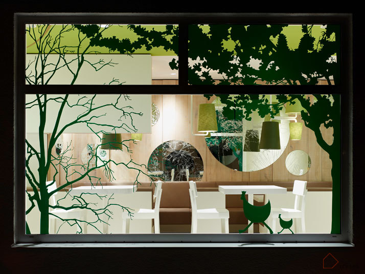 新的餐厅内部,清新而充满活力,高品质舒适的Wienerwald传统和德国美食结合,创造出一个全新的视觉和建筑空间。新的调色反映了菜品的新鲜度,绿色同时也用来迎合白色。自然的色调延伸贯穿在整个空间,以确保舒适性。地板、长椅和用餐区的墙壁,舒缓了内部空间,餐厅中的绿色点缀同样反映在镜子中。虽然空间面积不大,但通过调色及空间布局,为顾客带来宽敞舒适的感觉。同时,俏皮的小细节也使空间充满了乐趣。