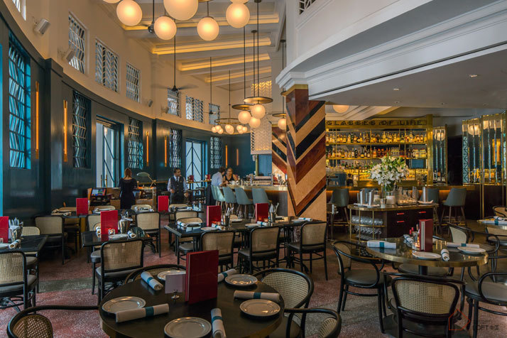 餐厅选用的材料及图案灵感来源于地域历史及殖民时代的美学艺术。黄铜,大理石和水磨石搭配高光板应用于餐厅内不同的组合空间。定制灯具成为餐厅中特别的存在。一楼,包括大理石铺就的马蹄酒吧和主用餐区,上部的夹层,另有一个单独的酒吧,选用暗色调,营造出一个与下面的餐厅截然不同的休闲氛围。