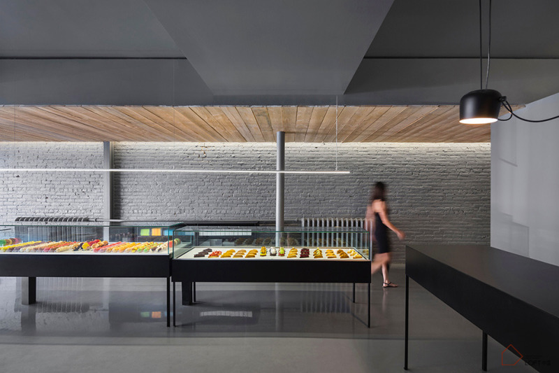 中性灰色内饰提升了展品美妙的形状、质地和色调,自动将感觉隔离,使糕点本身成为唯一的焦点,使顾客们一进入就大饱眼福。所有的糕点在内部后厨制作完成,这里与前方店铺用一面中高的墙隔开,使声音和味道都可以飘散出来,美妙的香气不停地挑逗着顾客的感官,忍不住大饱口福一番。