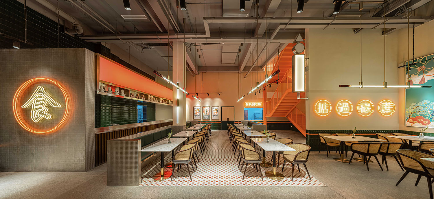 设计师希望茶餐厅在现代都市的生活场景中,作为商务洽谈和各种社交活动的场所,能创造出多元化的文化氛围,让顾客感受到中西文化相结合的独特魅力的同时,更表达对港派文化的一种故事性的延续,让人们重回八十年代的香港地,体会到浓厚的休闲文化氛围。
