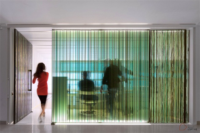 空间选用优质高雅的材料,来实现建筑空间元素的非物质需要。工作空间,由感知,路径,光,反射和流动性决定。由二次回收的绿色和黑色玻璃板打造的条纹屏风,灵感来自冰块,增强了光的反射及振动,创造出不断变幻的空间。除此以外,诊所内几乎为全白色装饰,仅在手术室内点缀了几把红色或蓝色的椅子。