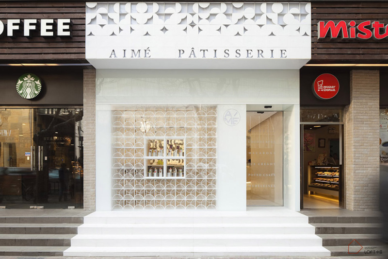 Aimé Pâtisserie糕点是进入上海的新品牌,其旗舰店位于淮海路,对面是大型的高端购物中心,周围是熟悉的咖啡店及甜甜圈店,门前是一个繁忙的巴士站,这里人流众多,竞争激烈。在混乱的氛围中脱颖而出,吸引顾客,成为店铺的挑战所在。
