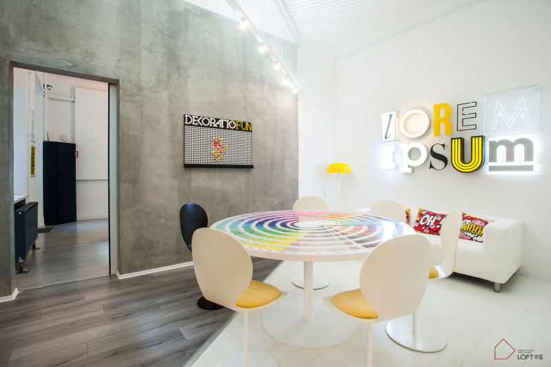 空间设计中体现着品牌及设计概念:如墙上的Lorem Ipsum标志;设计成一个大Pantone调色板的圆形会议桌;用世界著名超级英雄的人物符号向迪斯尼非凡的品牌成就致敬等。整个工作室中使用漫画作为参考,即流行文化在美国应用艺术与广告的演变中所扮演的角色。每个房间都有一些漫画插图与空间的功能相联系。