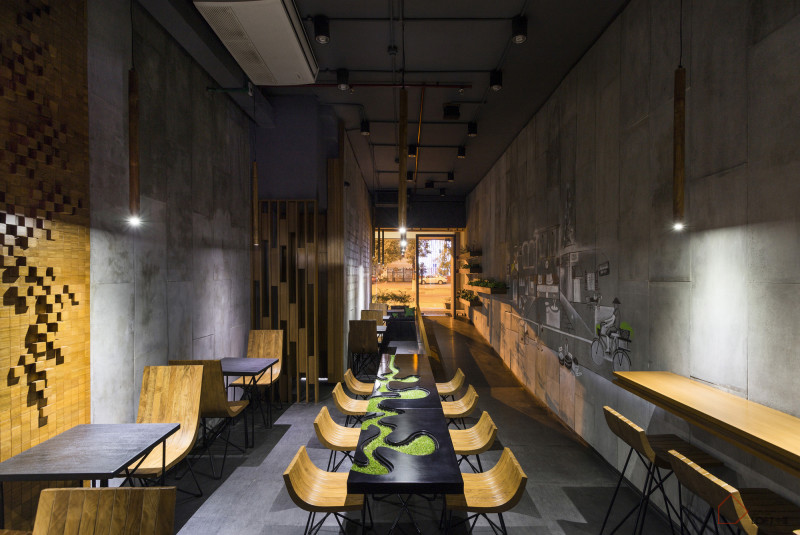众多材料中,最重要最明显的是使用混凝土创造出一个整体的印象。“新型街区”艺术为空间增添了温暖感,所有不同高度的木块被分别放置,创建出空间所需的三维表达及木质纹理的自然游戏。整个空间家具的设计和开发配合了特殊的餐厅个性,共同创造了一个独一无二的景观。
