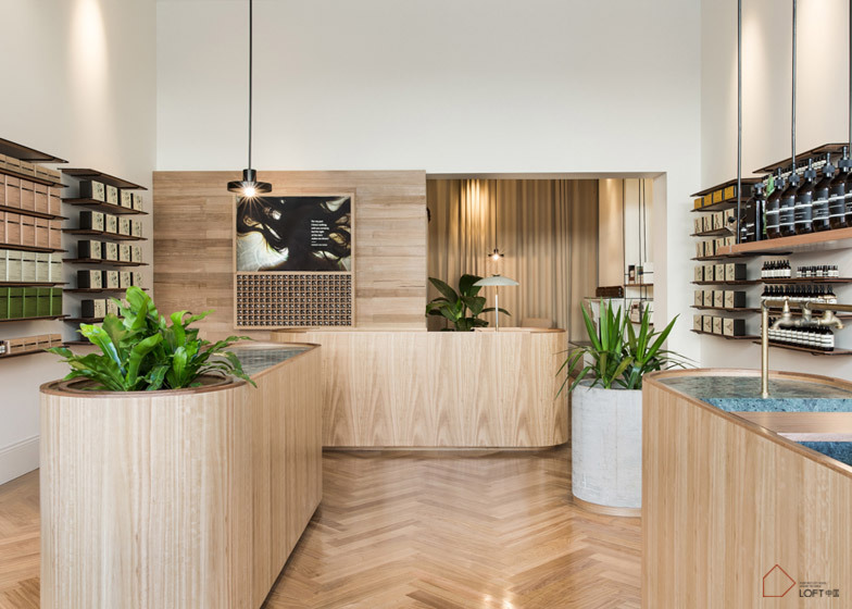 Genesin Studio使用浅色木材和仿古大理石打造了皮肤护理品牌Aesop位于Adelaide的专卖店。暗绿色的维多利亚门面与古老的建筑立面完美融合,优雅又朴素。