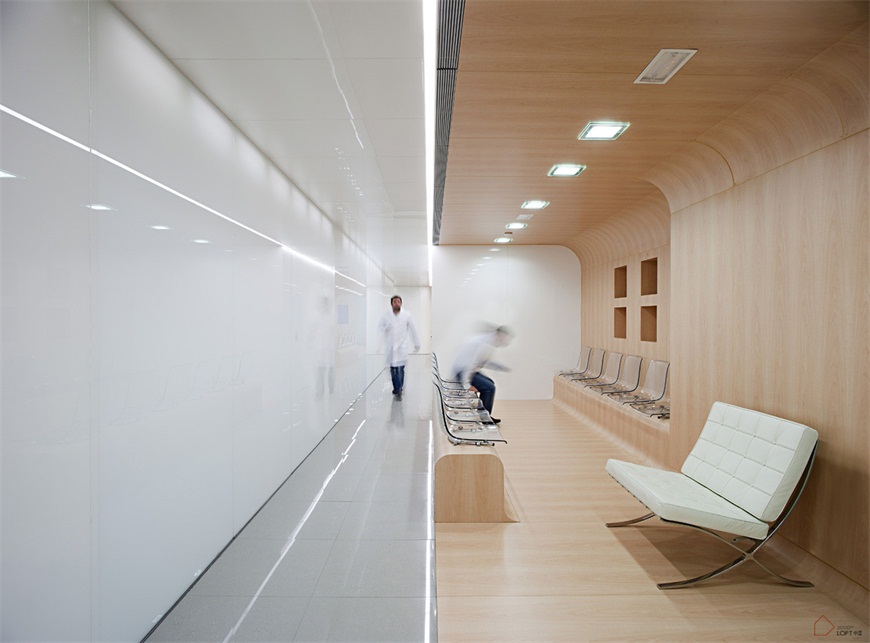 第一,Continuous。患者可以随处感受到诊所的整体理念。人流量的变化全部围绕巨大的贯穿整个诊所的白色玻璃墙,从接待到等候室及医疗室。医务人员的流动也与玻璃墙走向相适应,医疗活动的发生无处不在。第二,Consecutive。功能性项目成为诊所的反映,成为治疗中心的内部情形。主要用途遵循一个连续的形式:接待—等待处,环形走廊,实验室—储藏室—消毒—办公室。第三,Contiguous。空间建立了一个有组织的材料、纹理和反射的交换,形成连续不同的空间体验。如折叠木材包含的等待室和接待区。玻璃周边的高光饰面等。第四,Light Everywhere。玻璃和光的形式结合,覆盖了整个区域。如医疗室的设置,可以利用连续的自然光线。光穿透玻璃,首先进入内部工作区然后进入等待室。