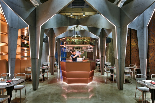 设计由空间中轴线开始,打造对称的拱形天花,加上倒三角形支柱,以此强调天花高度,同时扩大空间感,使其看起来更加宏伟。为了降低项目成本,空间原有材料被保存下来,只增加水泥板支柱和铁质屏风衬托原有的混凝土墙,使空间看起来自然不造作。落地玻璃前安装镂空铁锈屏风,既阻挡窗外不协调的景观,又保证了自然光线的进入,同时三角形的镂空又与整个空间主题相呼应。各条支柱上设置不同的灯光,创造出空间白天和黑夜的不同景致,营造出多样的用餐氛围。