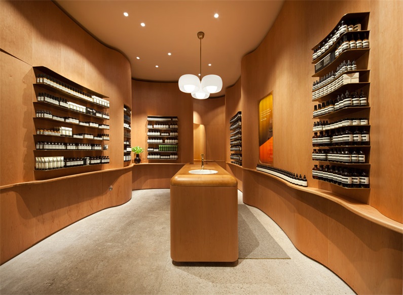 皮肤及头发护理产品被展示在店铺内部的黄铜货架上,这是Aesop位于斯德哥尔摩的第二家专卖店。独特的弯曲的木墙灵感源于瑞典建筑师Erik Gunnar Asplund。出自In Praise of Shadows。