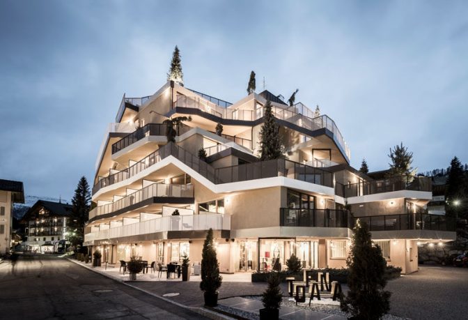 Verena Frena和Gunther拥有的位于意大利圣卡西亚的Hotel Tofana酒店,由建筑公司noa*重新设计。其建筑的两个外观造型设计模仿了白云石山脉的顶部,使酒店与周围的景观融为一体,更为和谐优雅。酒店的露台和阳台上布满了针叶树和植物,这些树和植物通过垂直的斜坡与楼梯相连。进入酒店,客人被带到一个有着悬挂的椅子和桌子的空间,这里有两个面板的天窗。这种摇摇椅的签到服务为客人提供了独特的酒店体验。酒店大堂的设计采用了绿色的色调,营造出一种置身于酒店周围的高山草地和森林的感觉。