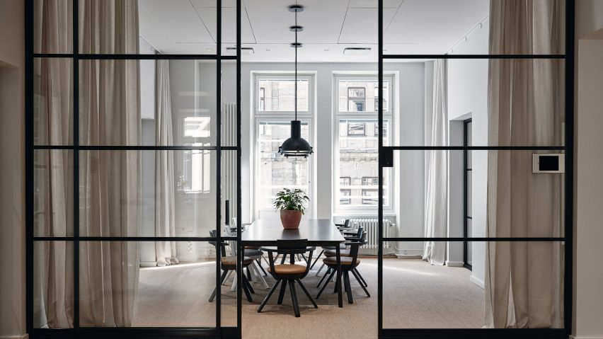 房间被全高度的玻璃隔断分隔开,有精致的黑色金属框架,允许从大窗户进入室内的自然光。玻璃幕墙采用滑动嵌板,如果需要,可以打开来连接空间。同样的系统也可以在不让人分心的情况下,为电话亭提供隐私。在规划空间和家具时,设计师希望它具有很强的适应性。希望人们可以用各种各样的方法来使用这个工作室,甚至在业余时间用它来做电影之夜和休闲的聚会。”