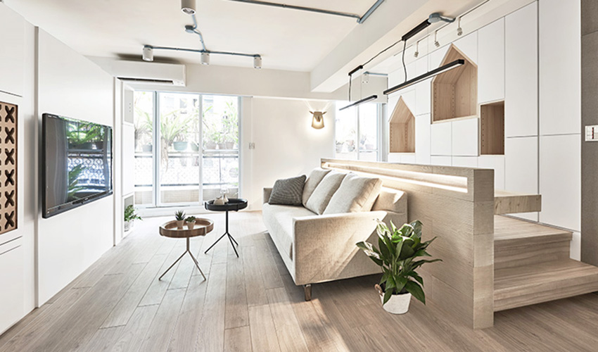 木地板是营造全屋温暖气息的重要推手,另外,设计师也推荐客厅与书房隔间的木纹水泥板,比起一般水泥板更有变化性,同时具备防潮、不变形等特征,户外阳台也能使用。