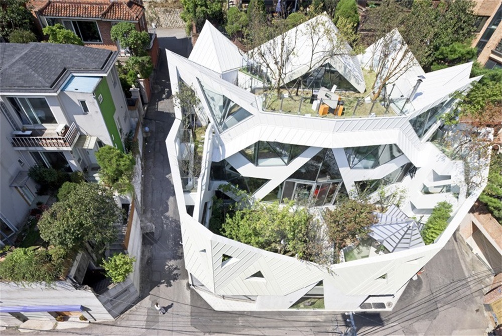 扎根于履露斋事务所的宗旨,Blooming House 不仅拥有盈满怀古氛围的韩文命名「花轩」,形体更完美融入周遭自然环境,将传统与现代共存的信念,重新诠释为人工与自然共生的实践。在建物高度限制下,为了赋予面积 353.92 平方公尺、起伏频繁的地面最大的土地利用率,宛如钻石结晶的不规则多面体外观,正是设计师暧暧内含光的答案——化地理状态为建筑型态,自诩为山棱脊线及邻里间的一枚交集;巧手挪用折纸概念,捏塑灵动而不僵硬的纯白花型住宅——Blooming House 乍看崎岖的花苞意象,不仅呈现出艺术意义,更饱含城市与自然亲昵相偎的人文价值。