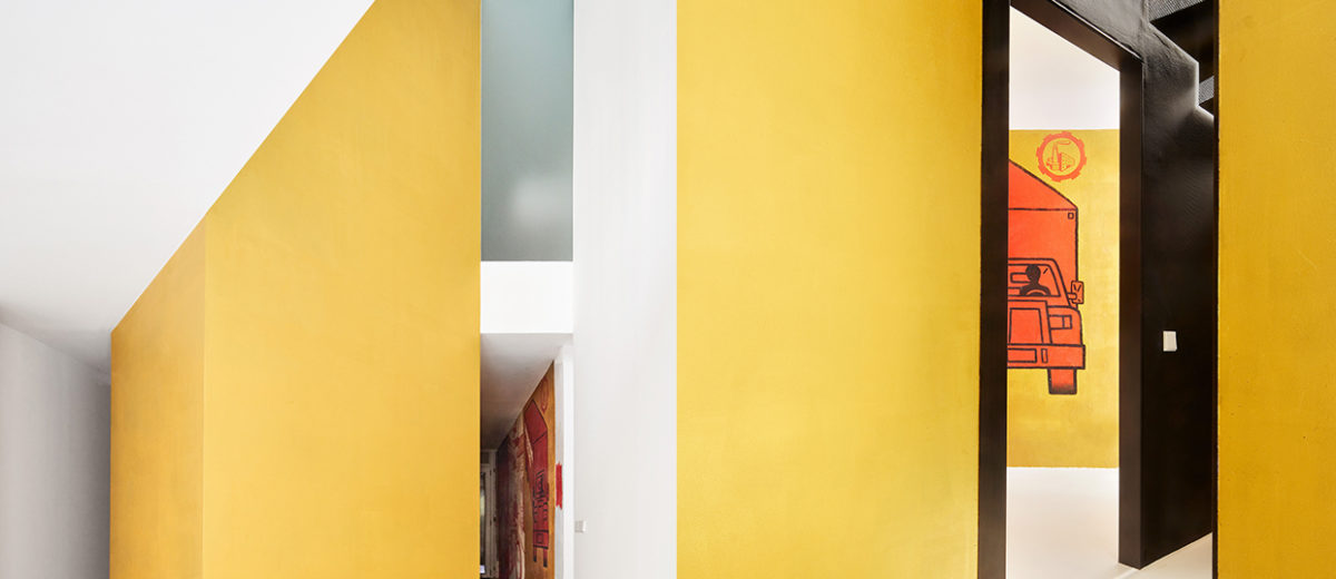项目的重点在于打造舒适宜人的内部空间复杂性,同时在各功能区之间组织合理的交通流线。因此,置入的盒子之一被用作楼梯间,螺旋的楼梯间让人在上下爬行过程中体会空间的变幻。空间中包含多个轴线,令空间循环加倍,体验感也得以增强。比如底层的连个出入口,以及盒子中心的轴线。底层保留了三幅巴西风格的画作,根据交通流线组织,将它们布置在楼梯口。