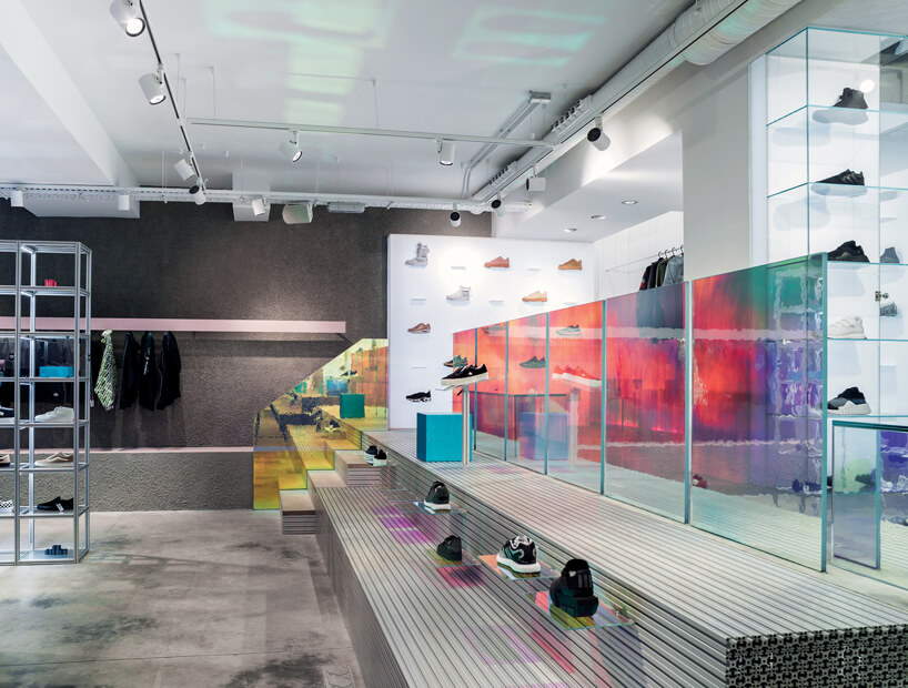 巴塞罗那A.P.O.工作室在马德里为sivasdescalzo品牌设计了一家使用铝制的型材来制作各种陈列架结构的商店,其灵感来自于运动时尚品牌在打造专业鞋时所使用的最新技术创新和原材料。利用材料组合,例如在天鹅绒般的窗帘前定位彩色阳极氧化铝型材,为高雅和工业之间的空间提供了完美的平衡。