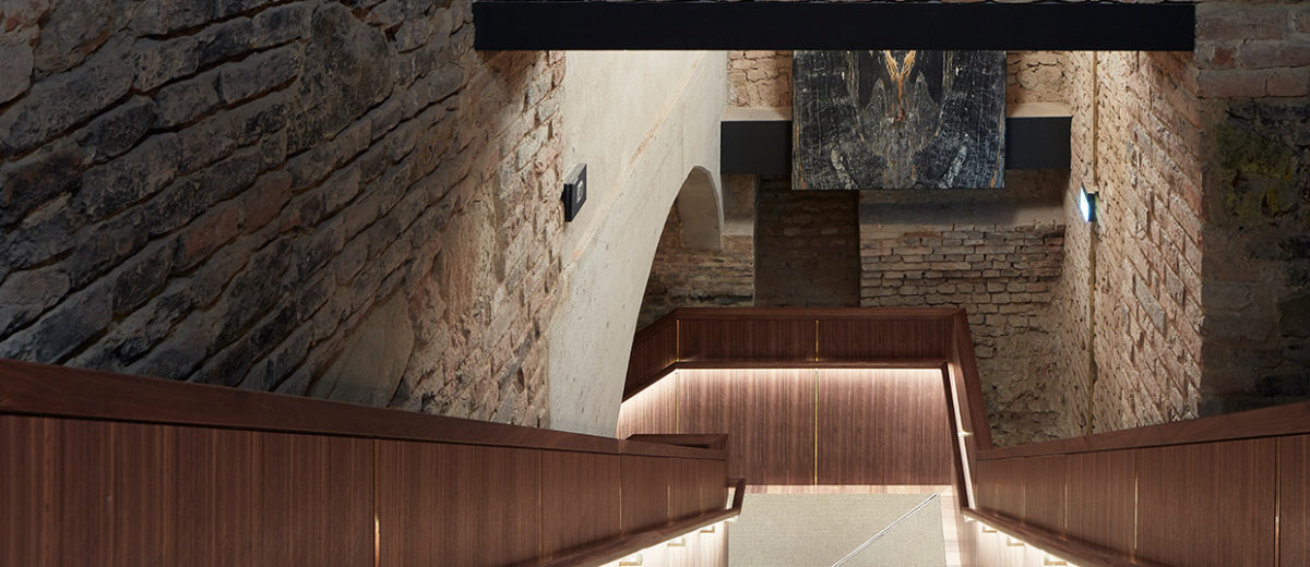在对维也纳传统小巷Berggasse中的一处18世纪末期的古建筑遗迹进行翻新时,一座砖砌的楼梯被发掘出来。该楼梯通往一个12米深、面积约有250平方米的地下室,也就是本案所在的位置。这座位于感恩教堂和弗洛伊德公寓之间的地下鸡尾酒吧可谓一件名副其实的美学珍宝。历史资料显示,这间地下室在上世纪50至60年代曾是一处半合法的空间,当时正是爵士乐在维也纳盛行的时期,以Joe Zawinul和Fatty George为代表的艺术家正活跃在舞台上。因而本案的“场所精神”早已确立,无需再做新的定义。