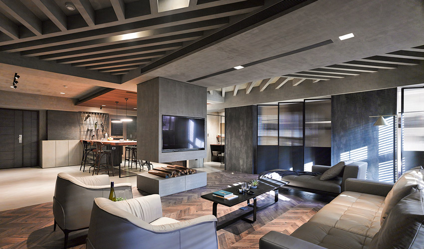 客厅、厨房及餐厅为一体相连的开放式设计,侧边整片熏黑文化石墙带入些许粗犷质材感,天花板以后制清水模工法做出几何风味强烈的交错线条,和深色人字拼木地板造型相互呼应。作为家中最重要的交流场所,客厅摆放多人沙发及单椅,中央电视柜设计成中空水泥柱,视觉上不会完全被遮蔽,份量感十足又保有穿透性,再摆上壁炉用木柴作为端景装饰,内部藏有收纳,为开阔室内定下一个份量感十足的重心。