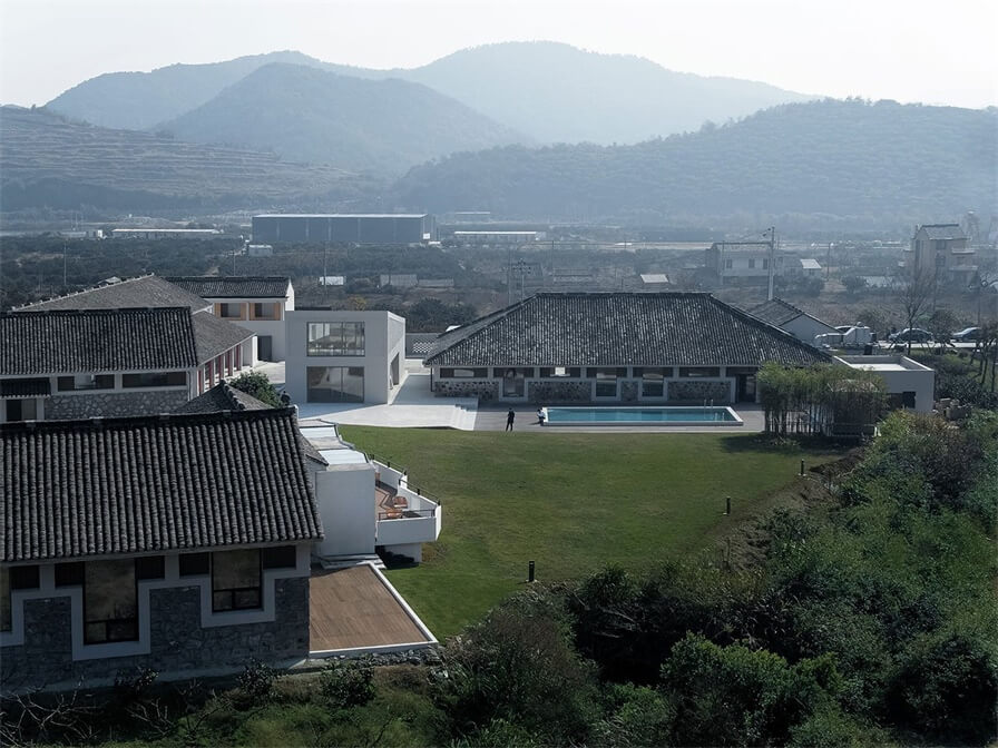 原场地由一条4.5米宽的主通道连接前后两个庭院及围绕着庭院的7栋老房,改造中设计师在尊重现有建筑肌理的前提下,调整和梳理空间格局,首先是拆除了正对酒店入口大门的一栋二层高的砖房,这栋原始建筑阻隔着前后空间并阻挡了视线,在其占地范围内新建的是一栋局部二层高的建筑,并在其西(西南)侧增加了一条3米宽的次通道,加强了前后场地在视觉上以及动线上的连贯性。其次是拆除了主通道与西侧草地之间的围墙,使建筑与整个场地及周围的山景融合更密切。在功能分布上,酒店的公共及辅助设施被安排在临近入口庭院的几栋老建筑中,新建建筑西侧的一栋老建筑改造后作为酒店的全日制餐厅,餐厅北面是新增加的泳池,泳池面向视野开阔的草地和远处的山。设计师通过疏导、围合的手法,使场地的动线更流畅,空间组合疏密相间,让人在不同尺度的空间中游走体验。