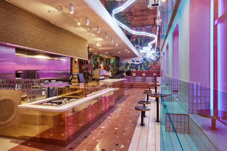 Midiya is a café in the centre of Vladivostok. Its area is 140 square meters.The main idea was to create something unique in everything, from the name of the cafe to the interior design and the menu. Midiya means a mussel, it’s an unusual name for a cafe, influenced by its location near the sea. All the coffee drinks recipes also emphasize the uniqueness of a local product. We tried to avoid clichéd coffee and color associations in the design. Midiya has all the shades of a pearl shell. We used lots of reflective surfaces in the interior: brass, mirror, steel, dichroic glass…The lamps over the group of high tables are in the shape of giant mussels. One of the ascents in the interior is a large collage, located directly opposite the entrance.