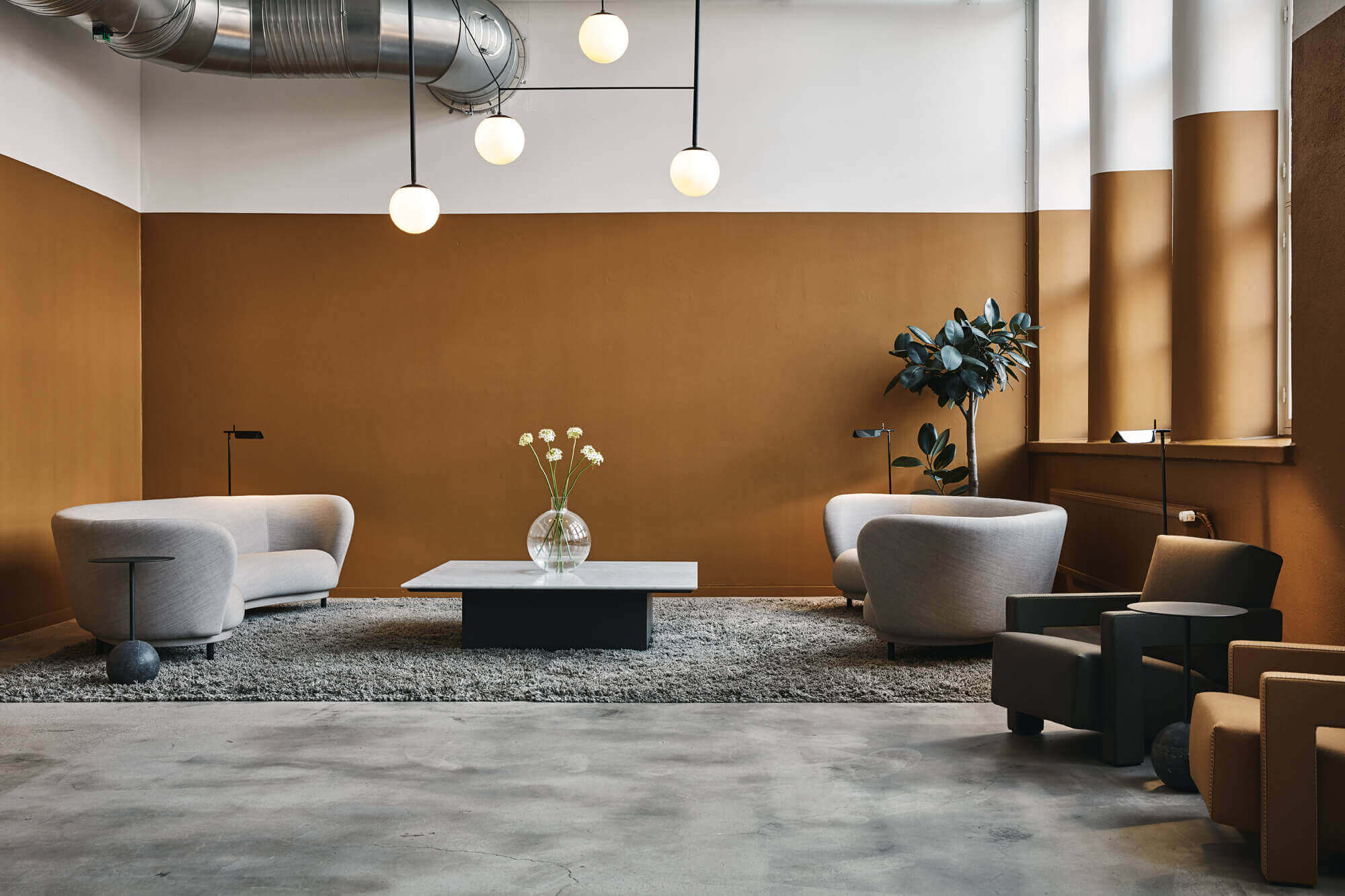 the over six-meter high industrial space, totalling 1,500 sqm, is divided into public and private areas to ensure interactions on many different levels. at the entrance, public spaces like the lobby and cafe encourage employees and customers to mingle. meeting rooms are situated along the long corridor that leads to the rear. here, as well as on the second floor loft, are spaces specifically for employees only.