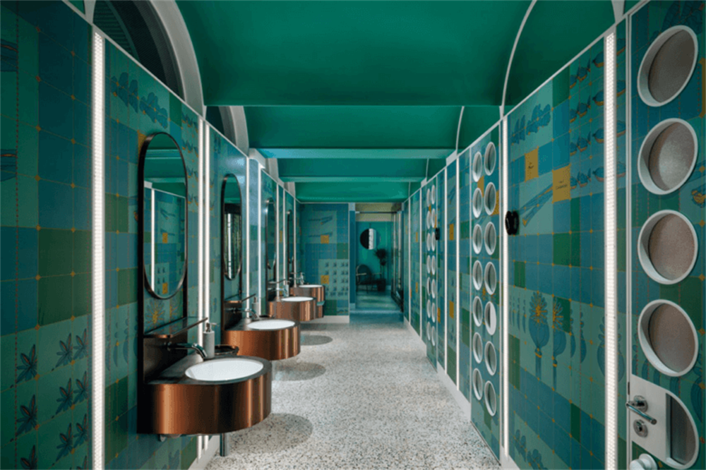 John Anthony guests enter down a staircase made of white metal and back-lit with diffused glass. The entrance offers a hint of the interior’s lime green terrazzo floor and triple-height arched ceiling, clad in pink tiles. The pink arches are reflected through the space in high-level mirrors.