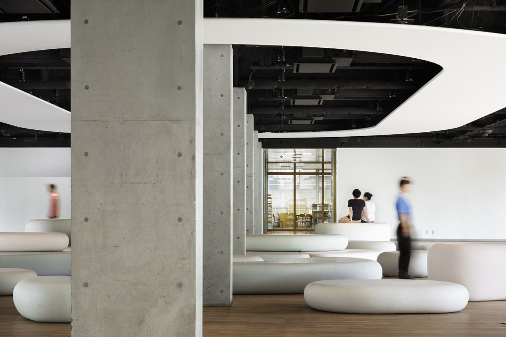 “ZERO SPACE” was created as a relaxing space for students at Musashino Art University.This space consists of glass windows with 35m in length from east to west and four entrances on each side.During the break time, many students pass through this space as a flow path. The layout of bench seats is carefully planned to block the central flow that is a shortcut. The design motif of the bench is pebbles. White zero-shaped plate is floating at the center of ceiling, and it creates different characters of the place inside and outside the plate. The inside is an area where pebbles are gathered, and it indicates a sense of the place where one could belong.