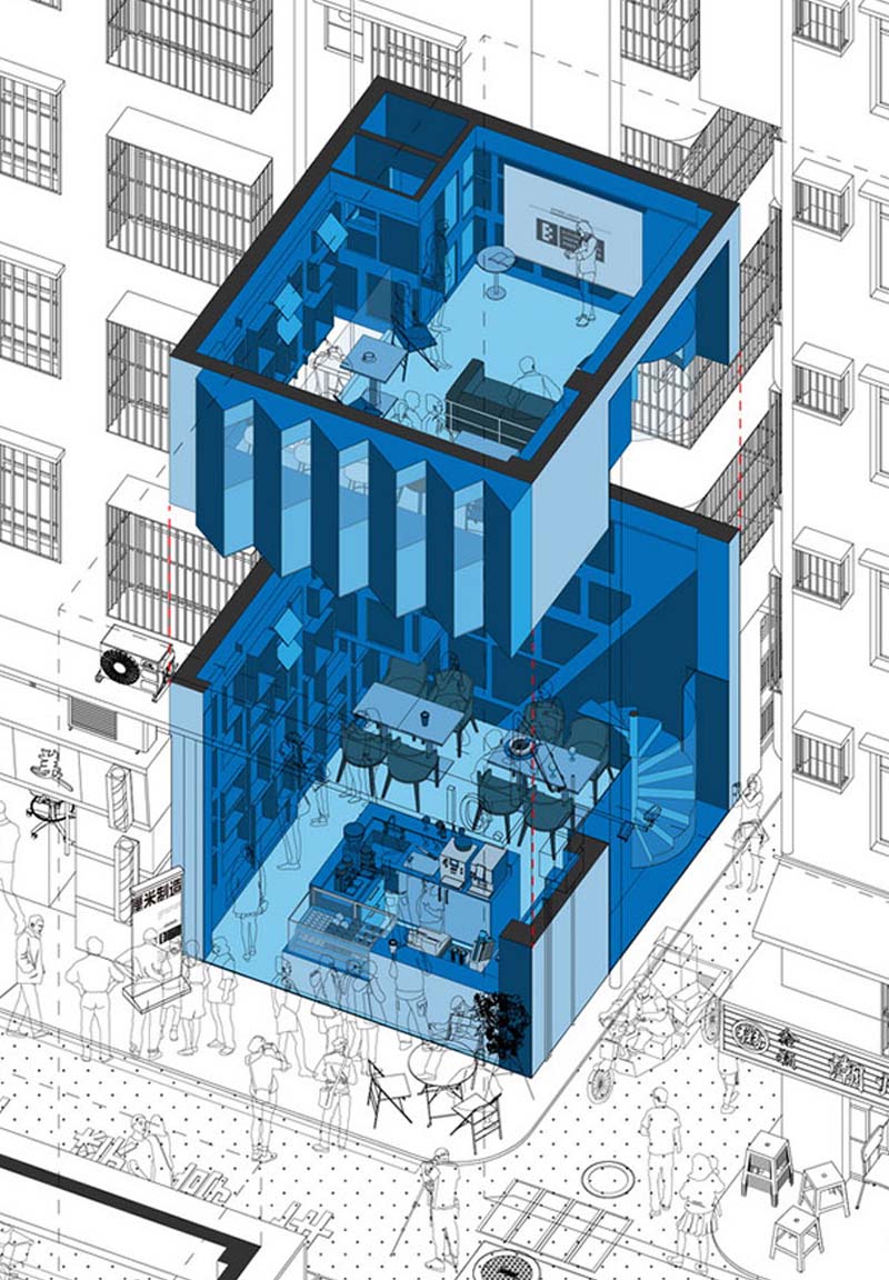 设计师的策略是最大化利用这两条街巷的空间特征,巧妙的将室内临街的商业售卖吧台、延展到街道的螺旋形楼梯及二层的观演窗台等序列性的功能空间与城中村里复杂多元的商业生活情境模式有机结合,因此建立一种微妙的、生动的、有趣的多维度街巷空间互动关系。结合新洲南村所在城市区域的空间属性与周边城市功能结构,突破传统单一的商业模式的空间形态,赋予这个空间更多的文化性、艺术性及公共性意向,为这里的消费人群创造最大限度的交流可能,从而进一步强化了城中村的多元化及多样性。基于现有的城中村街巷空间体系之下,重新构建一个整体纯粹的形象与相对杂乱无序的氛围形成强烈视觉对比,成为新洲南村的商业文化新坐标。