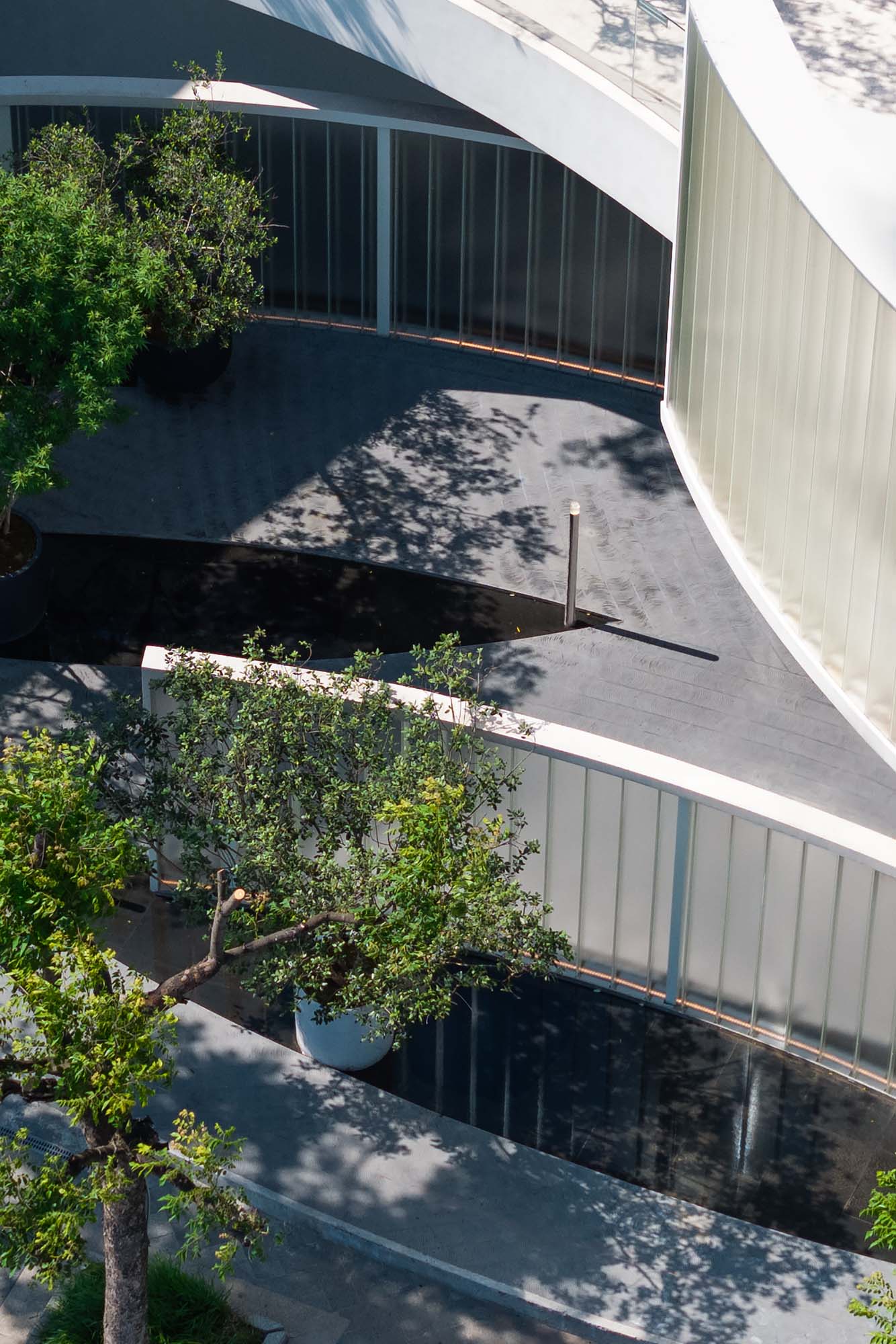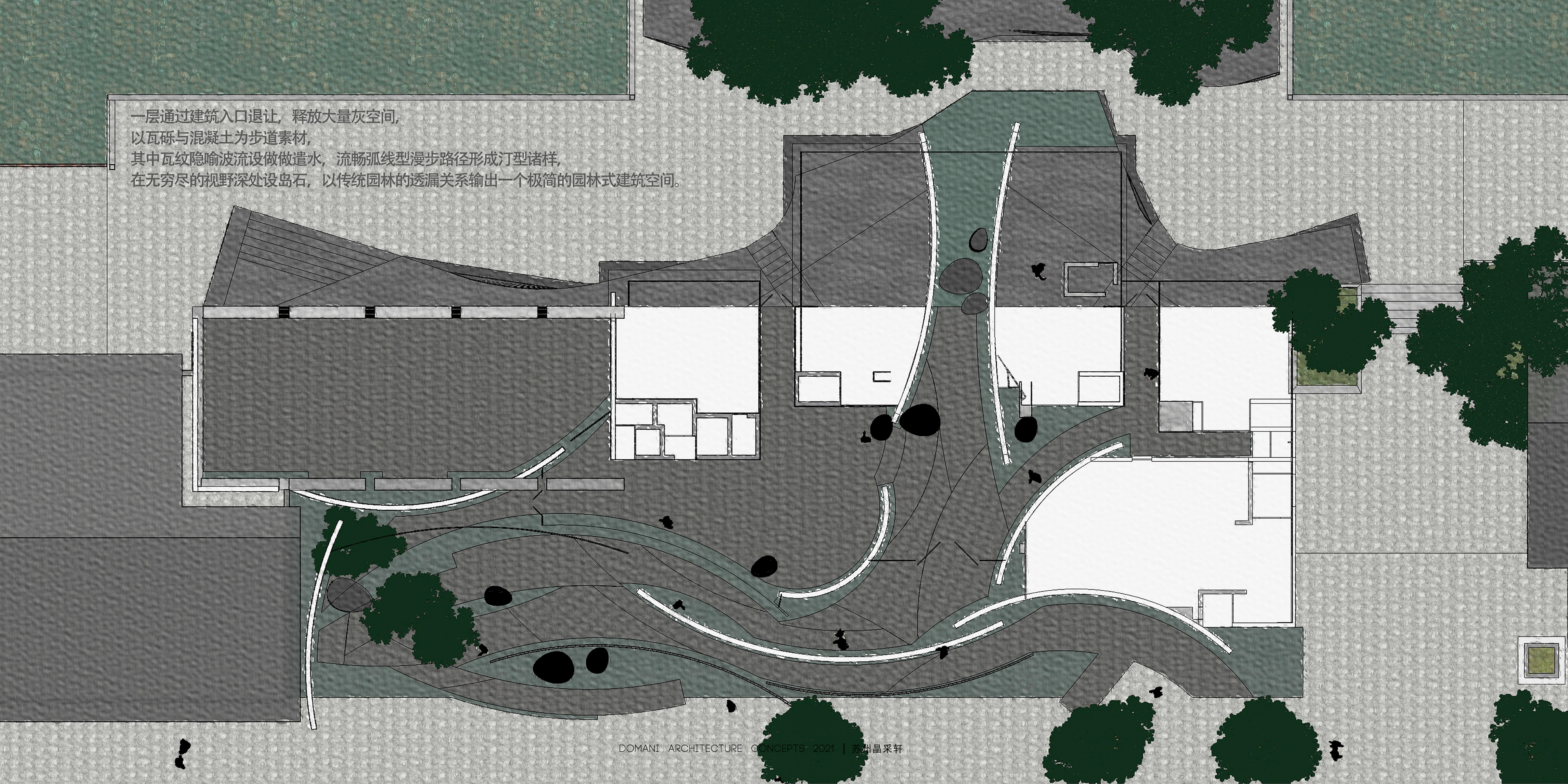 苏州晶采轩完全是一场精神上的园林重构及虚构,架设一种抽象的园林感是项目设计的初衷,园林亦是整个项目绝对主角,它强势覆盖了建筑,室内的表现空间。整个项目只谈古典园林中的精神的隐逸与流动性,通过弧形路径与虚实建构的光线形成‘望去空堂疑有路’的空间无尽感。