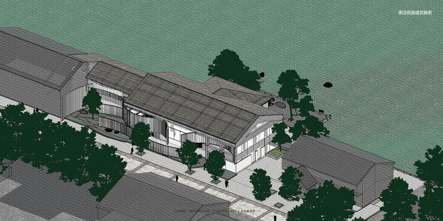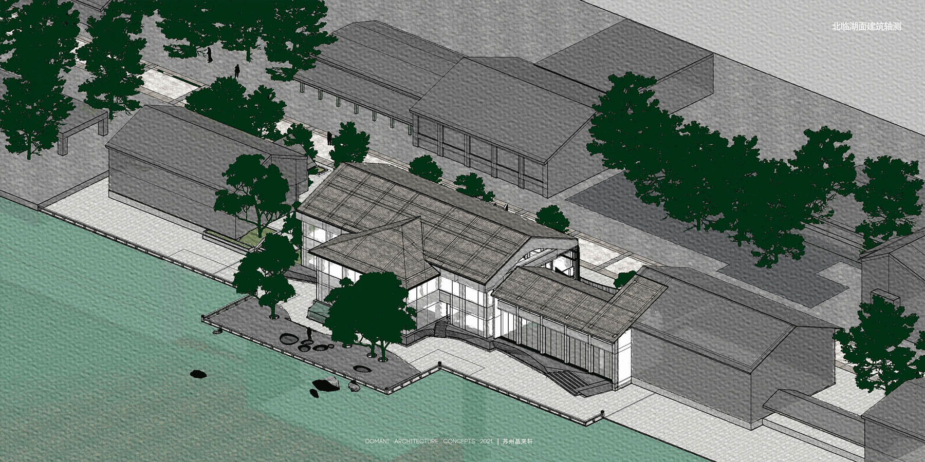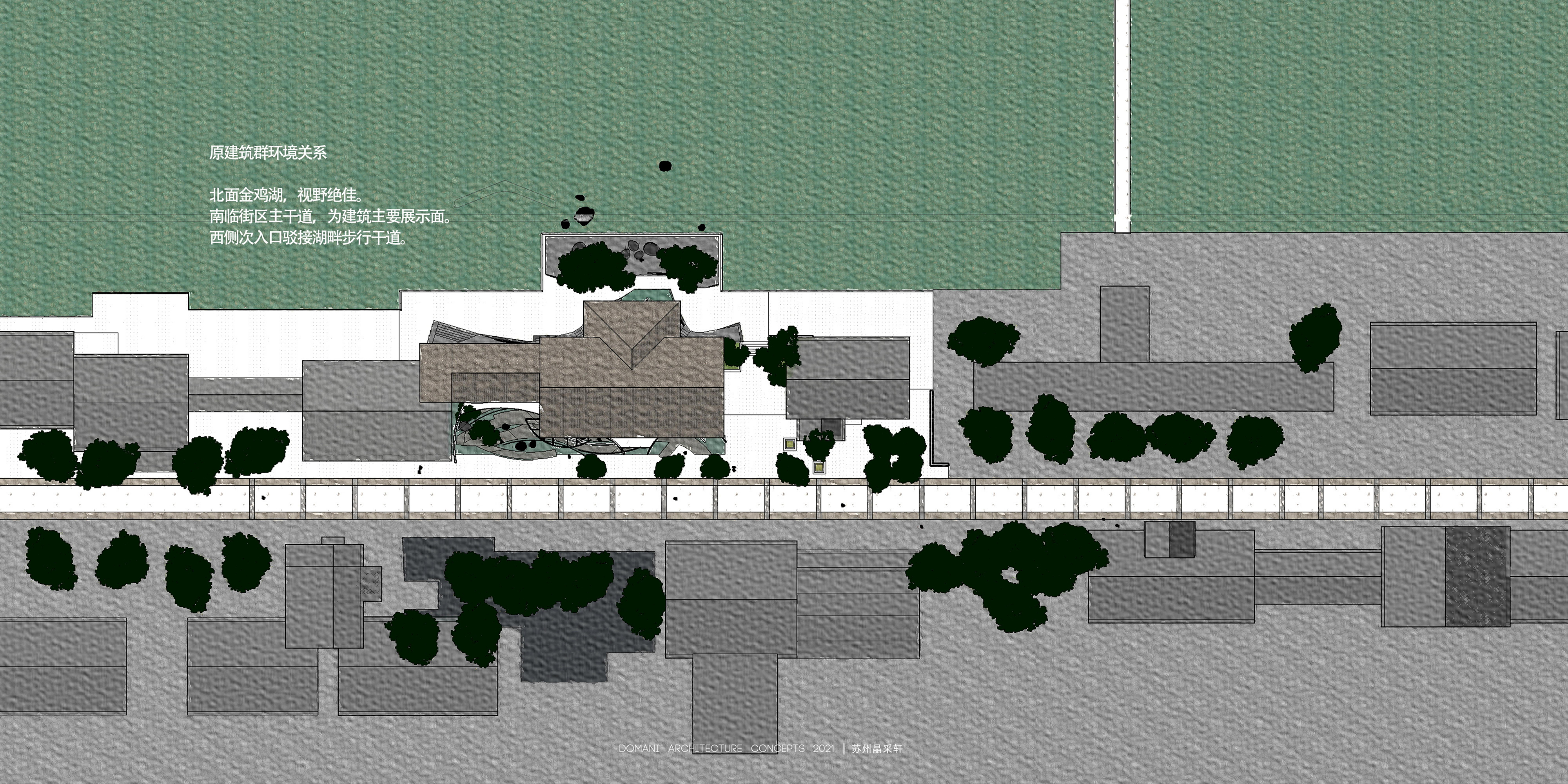 苏州晶彩轩中餐厅位于苏州李公堤,原建筑北面金鸡湖,视野绝佳;南邻街区主干道,为建筑主要展示面;西侧次入口驳接步行干道。项目设计目标为通过旧建筑改造激活该社区的商业活力,同时以对在地典型文化的重新阐述建立餐厅品牌的区域效应。