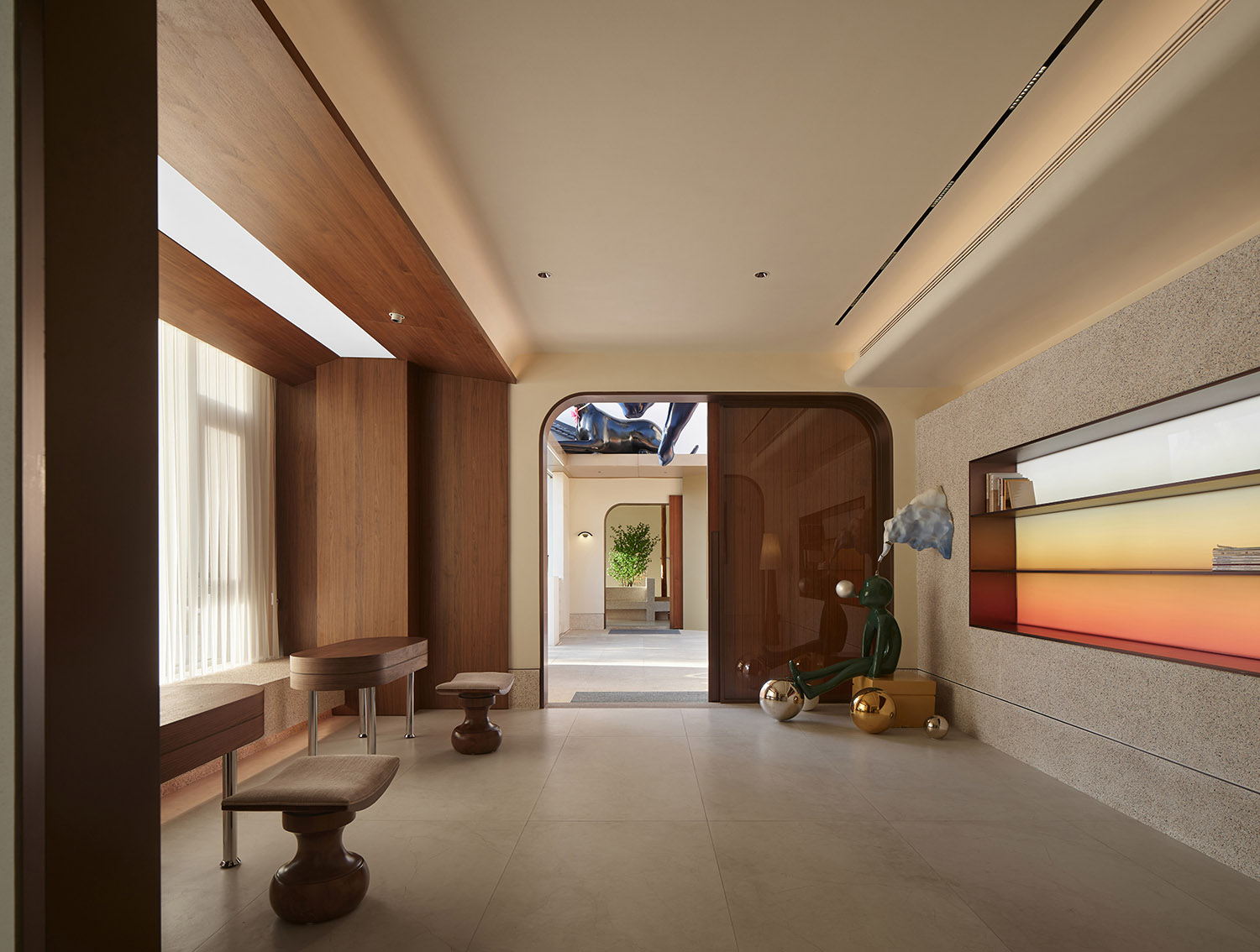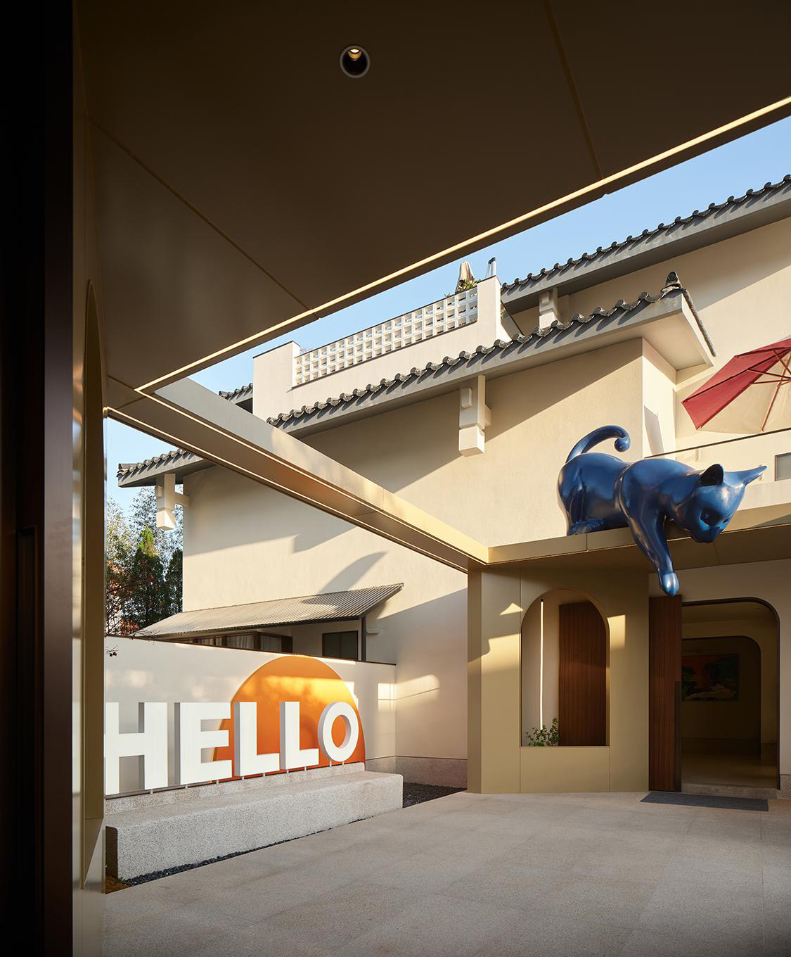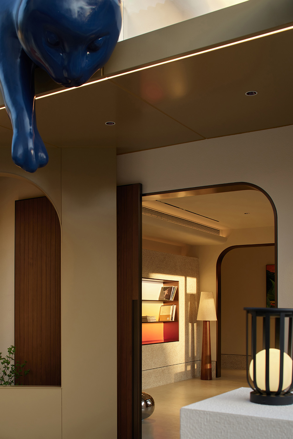 通过连廊上两只形态各异黑猫和蓝猫装置,开启一次探秘之旅。北客厅弥漫着闲适的诗意。绿植在光影中舒展身姿,似在浅吟低唱;座椅静候,等待着旅人的停歇;南客厅趣味盎然,充满幻想。