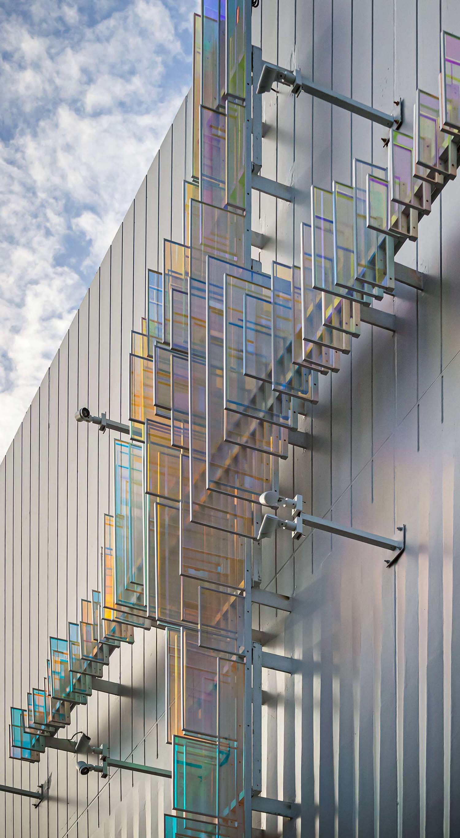 建筑外立面的创世纪 – 外立面的预制垂直褶皱如同旧约中的神圣帷幕,象征着人与神之间的隔阂。阳光照耀下,它投射出错综复杂的阴影,成为引人注目的十字架的画布。创世纪 9:16:“每当彩虹出现在云端,我就会望见它,并忆起上帝与一切生灵之间永恒的盟约。”