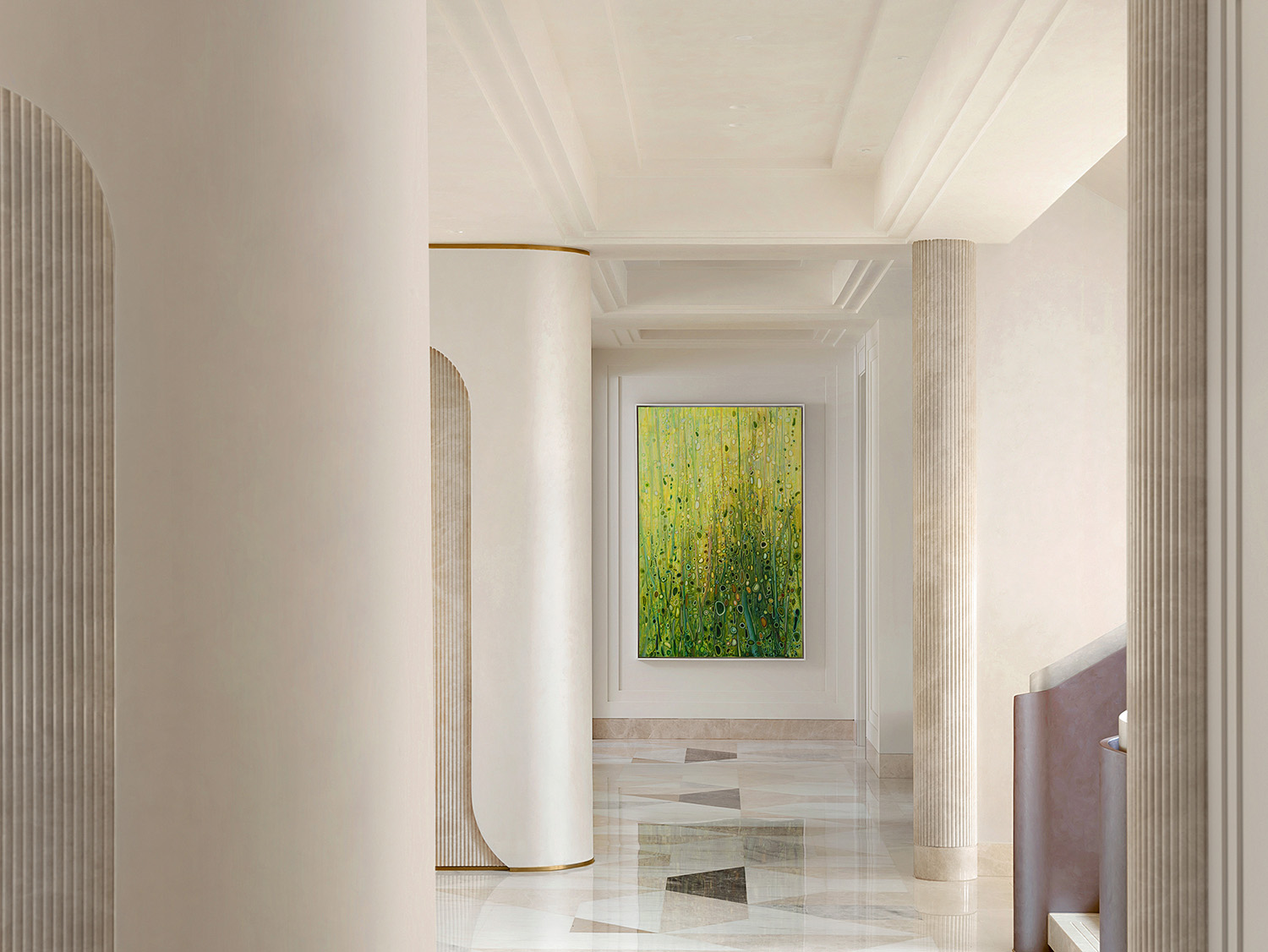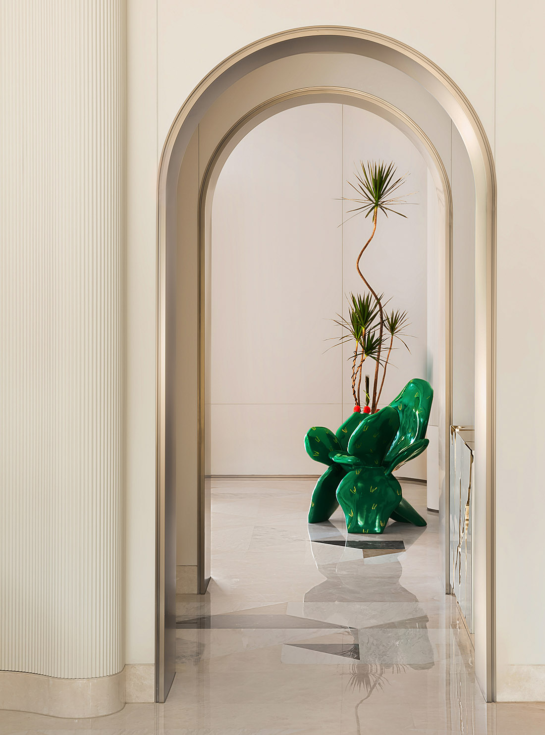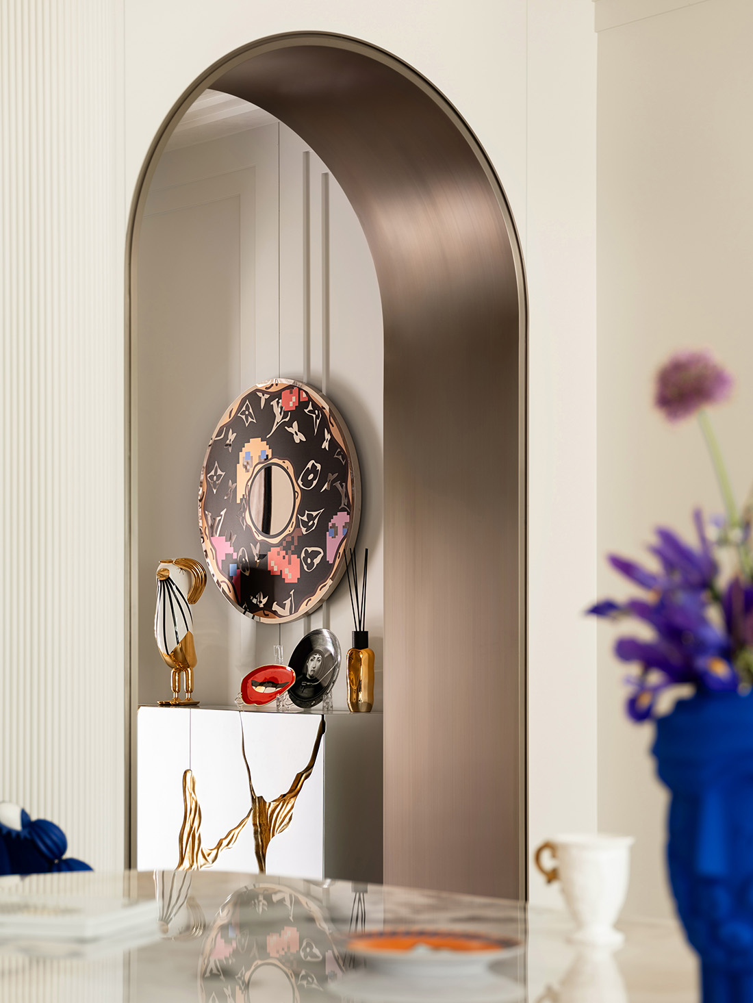 在结构上,设计师陆震峰运用圆形、拱形、立柱元素,让家内在充满流动的形态,蕴藏着对“合”的解读:象征着和谐、完满、家庭和睦。