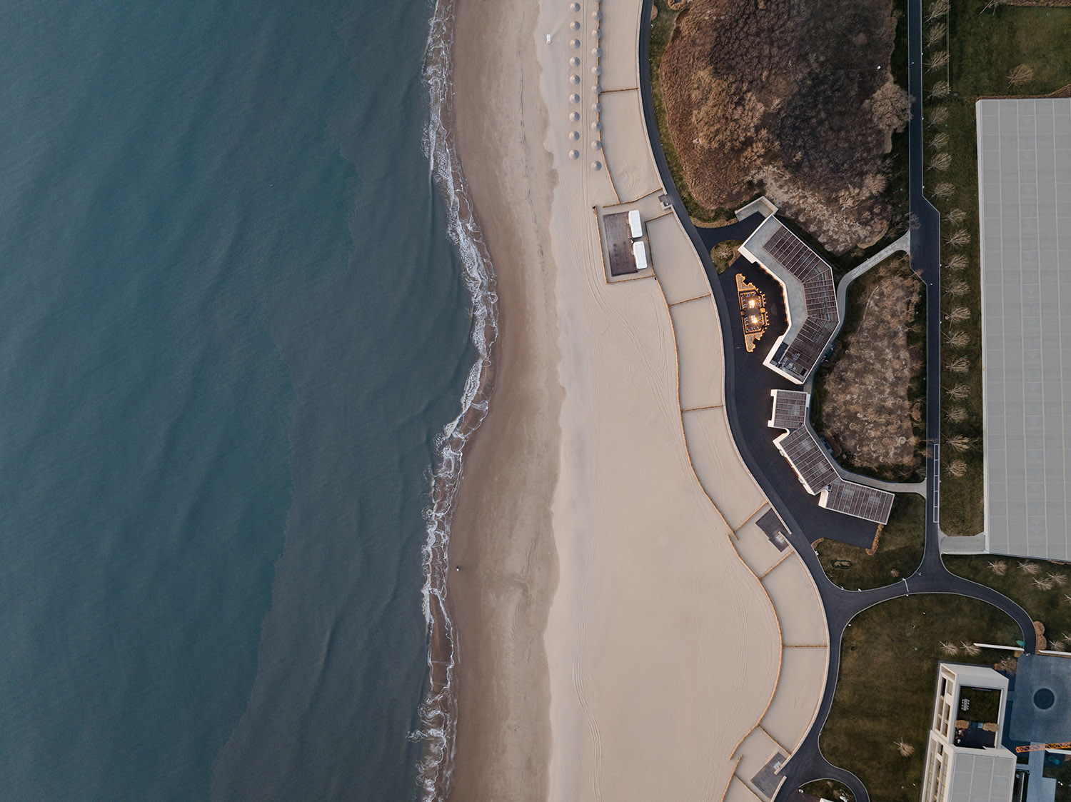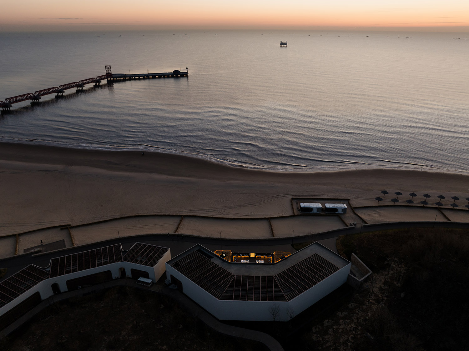 位于秦皇岛市如是海度假村内的“拾九”坐落于原始纯净的海岸边,拥有绝佳的视野与地理位置。这里不仅仅是一处餐饮空间,更像是自然景观的一部分,与周围的海岸线、沙滩和海浪相互交融。我们希望“拾九”能够从自然中汲取灵感,如同风与海水在时间的雕琢下,于海岸边形成复杂而层次分明的图案。正是这种自然塑造的力量,启发了我们对空间的构想——让“拾九”依傍自然而生,从景观中浮现,宛如一枚嵌在沙中的牡蛎,静谧地隐匿其中,却与周围环境保持着紧密的联系。