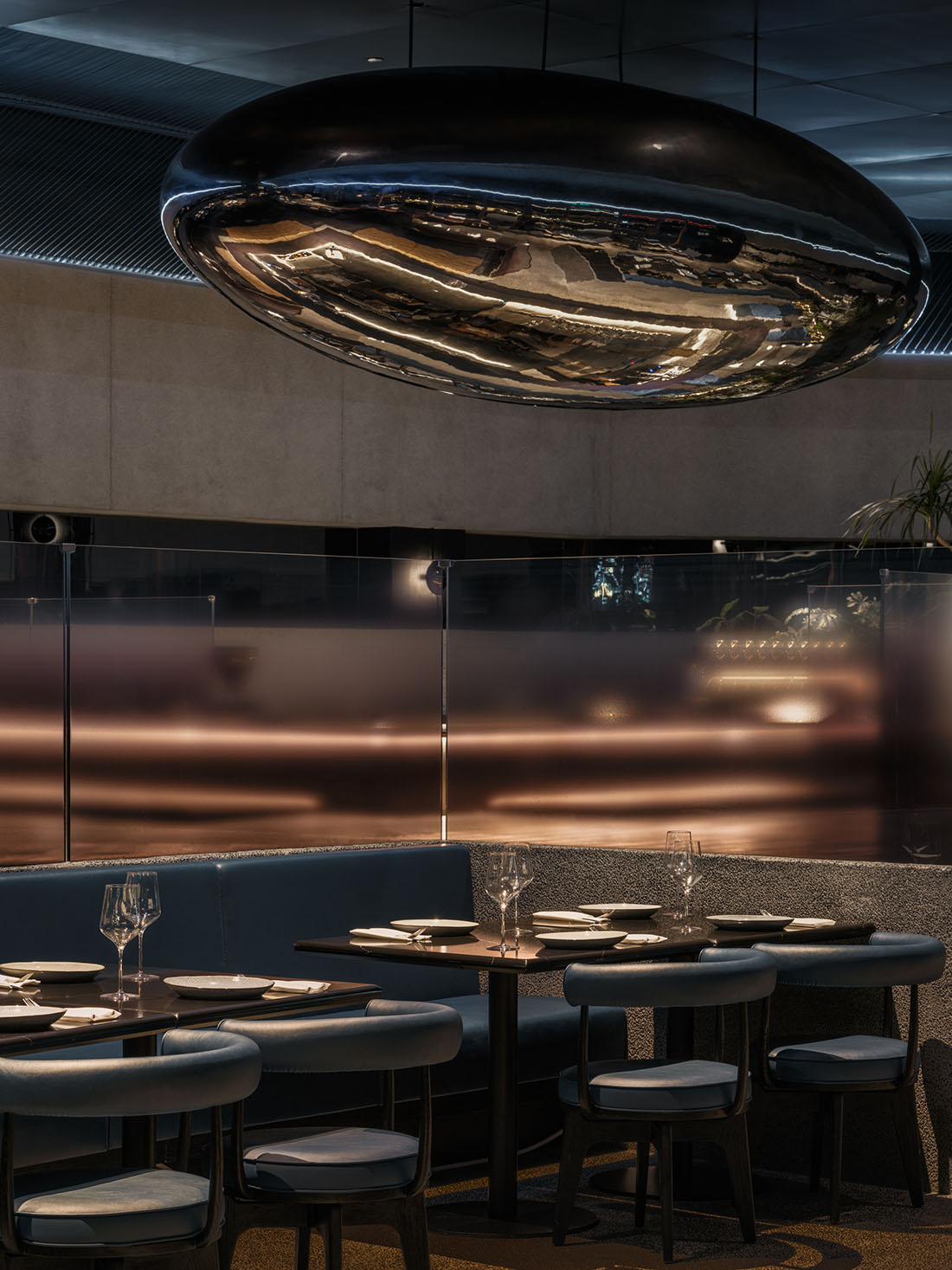 整体空间同样模仿了牡蛎精致且有机的形态,流畅的层次曲线被安排在环境之中,赋予整体设计独特的空间感。整个空间的核心是中央吧台,而吧台的顶面则有一个悬挂于天花顶面的镜面不锈钢球型装置,它象征着牡蛎内那颗璀璨的珍珠,成为酒吧的视觉焦点,同时凝聚着整个空间的动线与氛围。