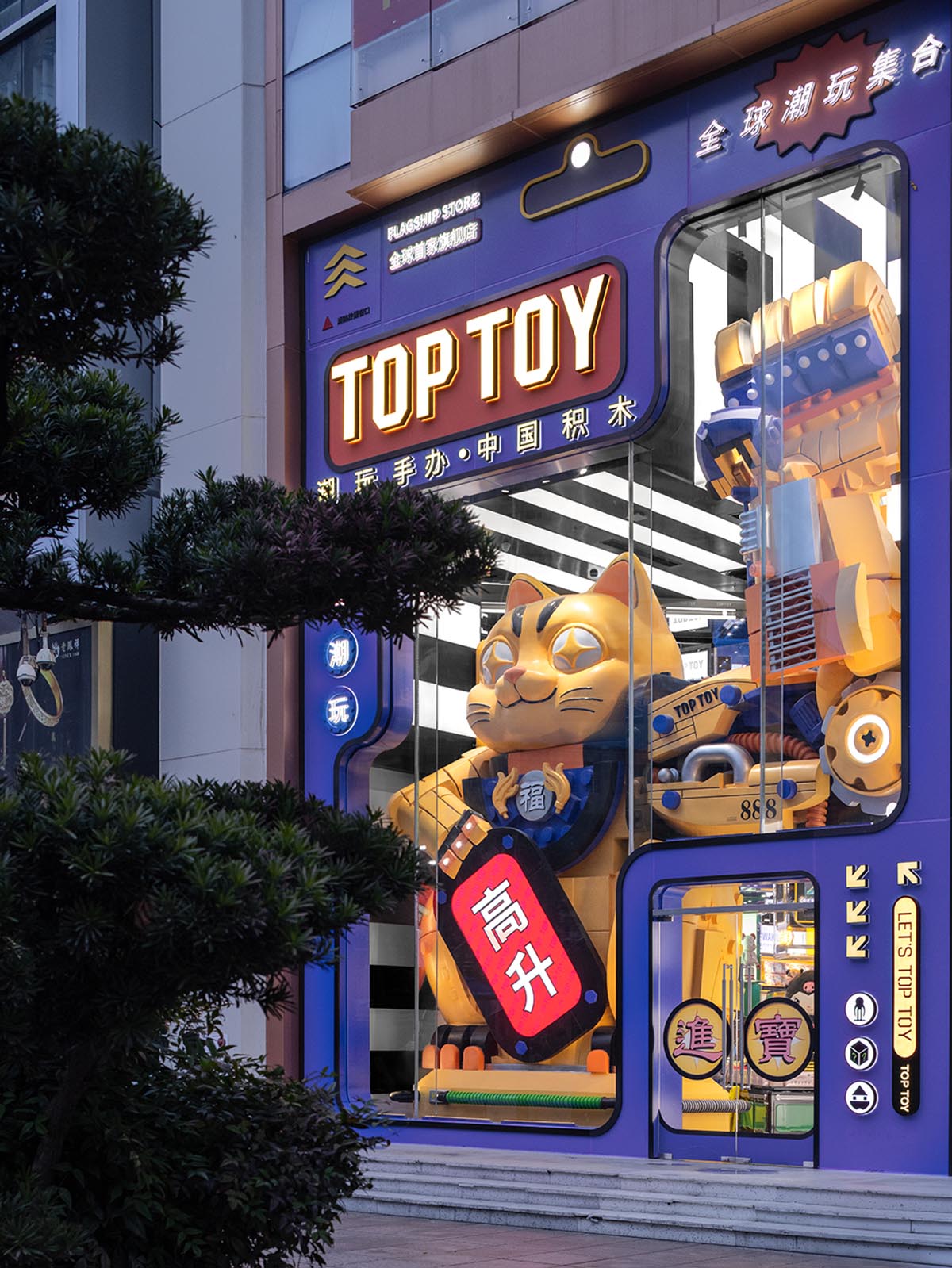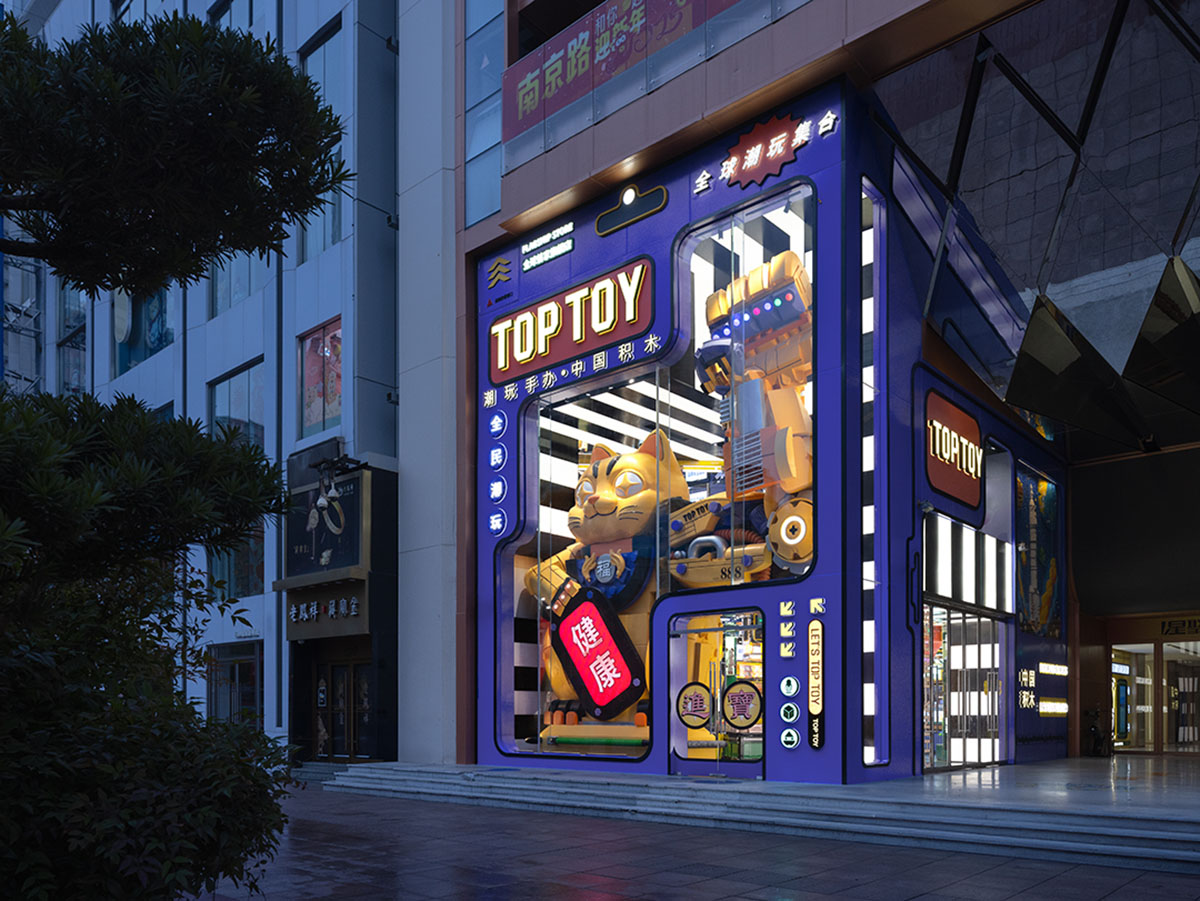 采取巨物化设计策略的外立面模拟玩具的吸塑泡壳,异形的巨幅透明橱窗成为空间入口的可视化包装,TOP TOY原创IP大力招财猫以超乎寻常的尺度震撼着人们的视觉感知,开门见山地建立起品牌标,引发行人观看与探索欲望,增加品牌曝光度。