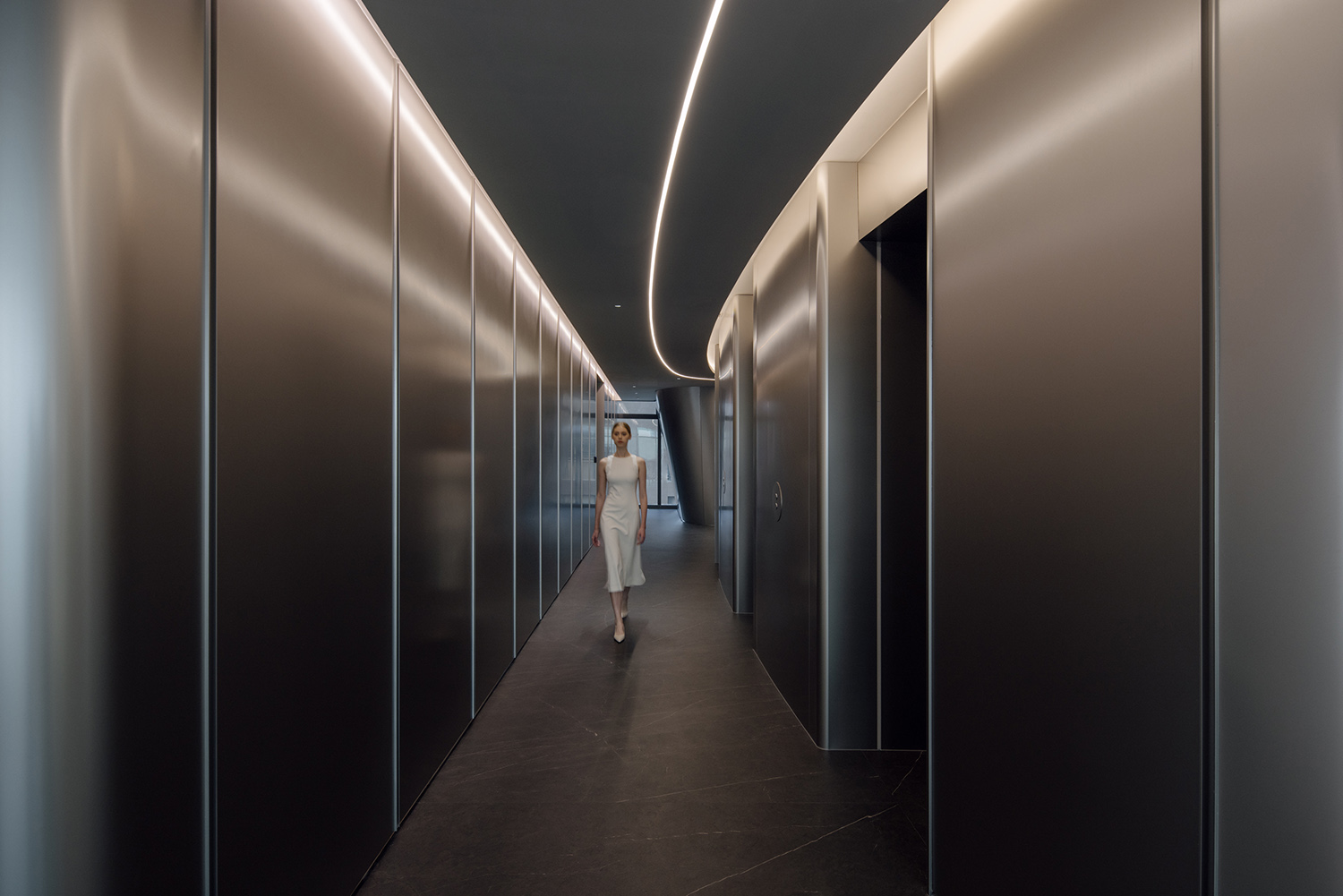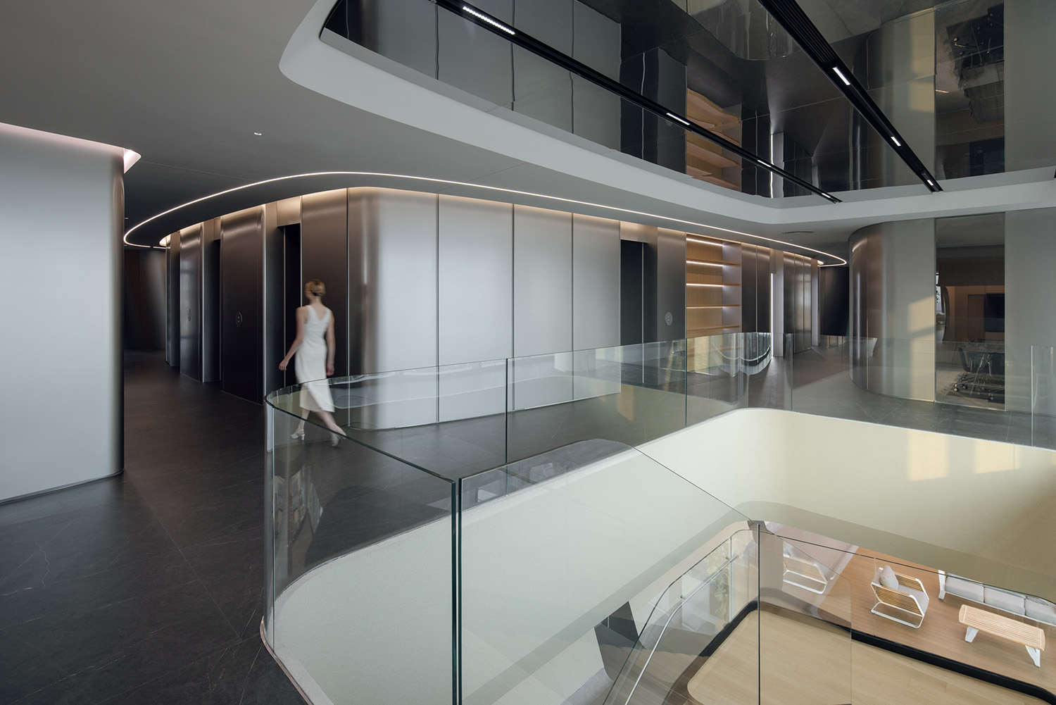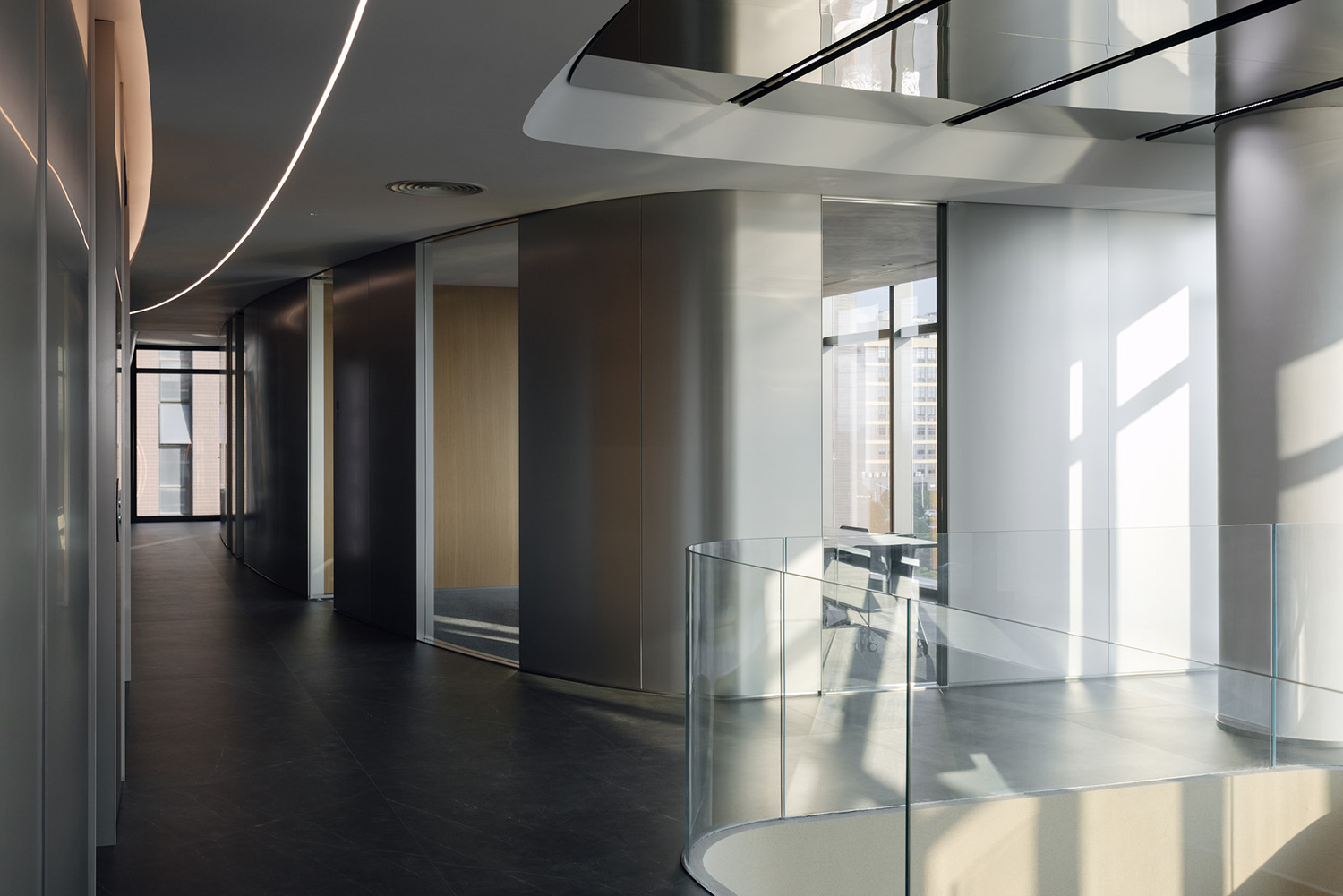 10 年前,电影《机械姬》探讨了人工智能的本质,如何判断其是否为「人」,以及如何与它们共处。而今,这一话题已转化为具体的空间表达。这些见证,也实践在空间之中。每一办公间,都宛如飞行器内部的独立舱,体现了技术与空间相融合的未来感。