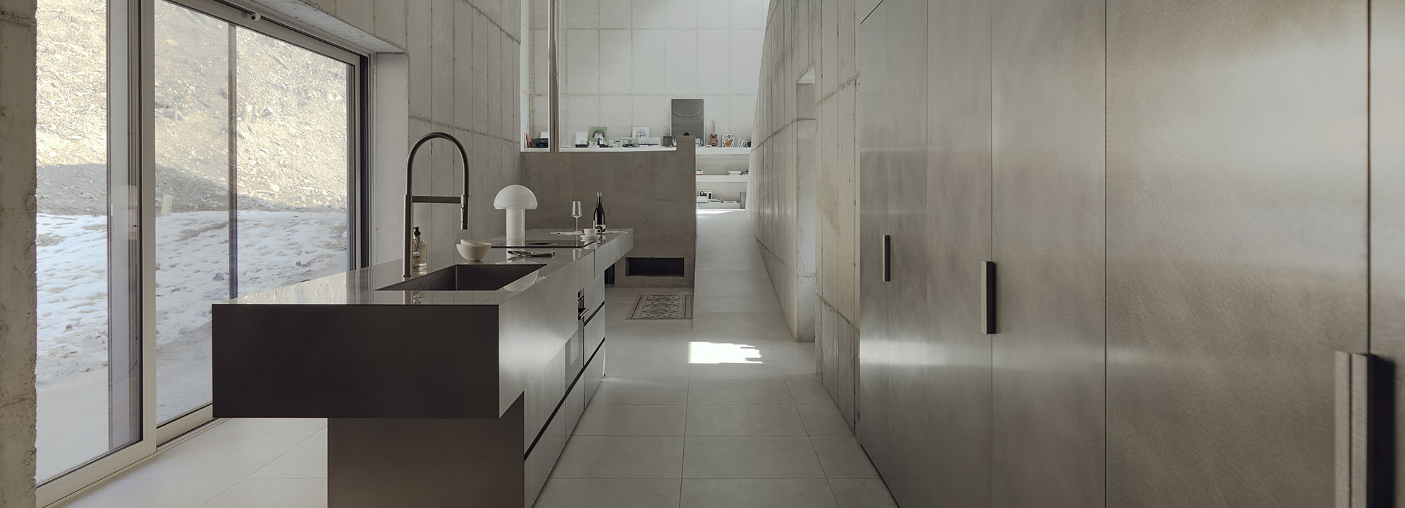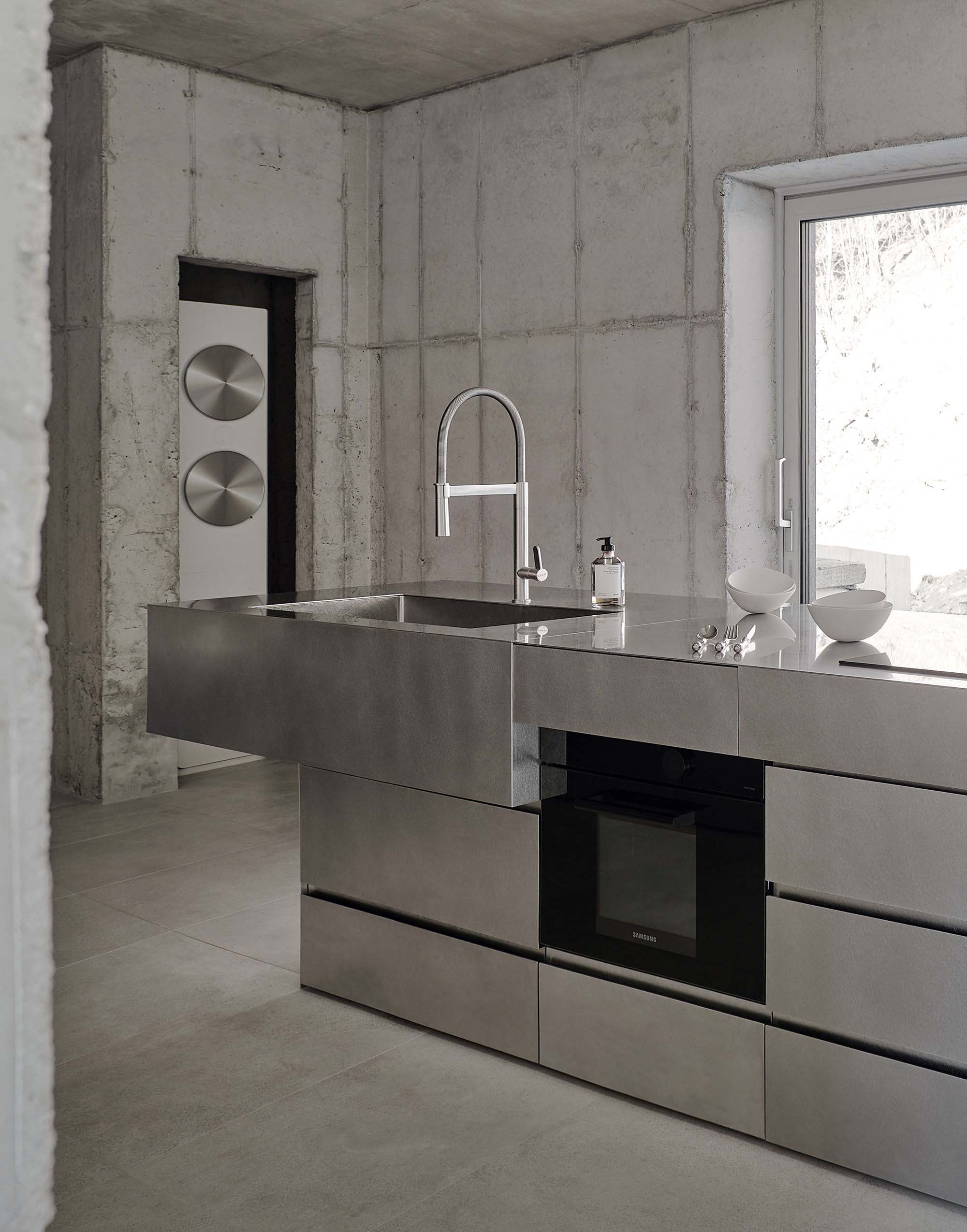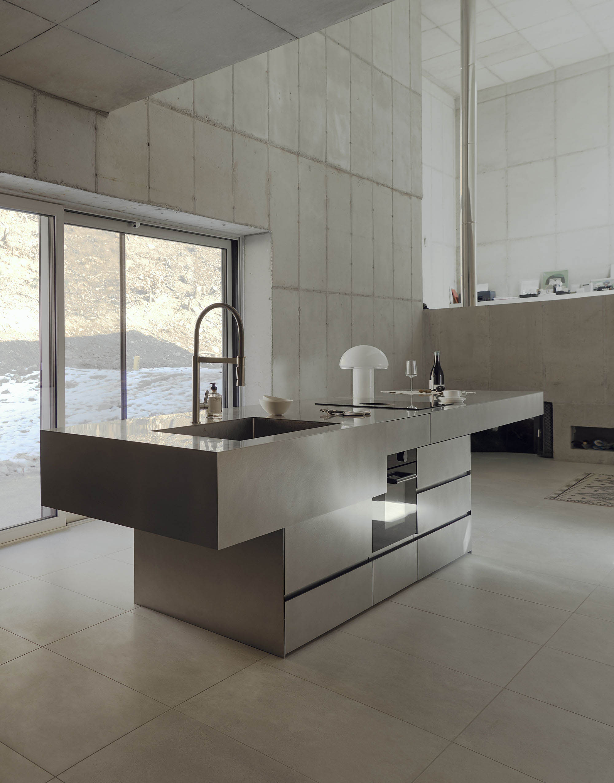 厨房的中心是一个 4 米高的金属岛台,看起来似乎可以摆脱重力的影响。它的浮动结构两端悬挂,没有可见的支撑,在野兽派的室内空间中营造出一种近乎超现实的感觉。这种视觉上的轻盈掩盖了其下方复杂的工程设计——嵌入式地板管道强化了设计,但肉眼却看不到。在这里,我们看到了为幻觉服务的工艺,技术严谨性创造了失重的外观。