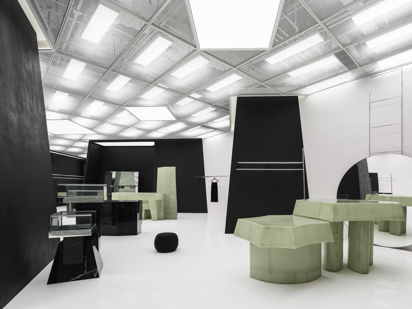 天花板的白色双层网状材质、隐藏式灯光与纯白的地板共同演绎“云雾”的轻盈与朦胧,行走其间,仿佛踏云而行。倾斜的天花设计从入口处缓缓抬升,如同被风卷动的云层,赋予空间动态的呼吸感。设计师从中国传统玉石中汲取灵感,将东方美学悄然植入现代空间。散落的绿色玻璃钢装置如同晶莹的宝石,点缀其中,平衡冷冽的基调,增添一抹温润的盎然生机。